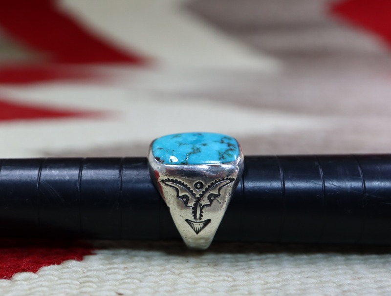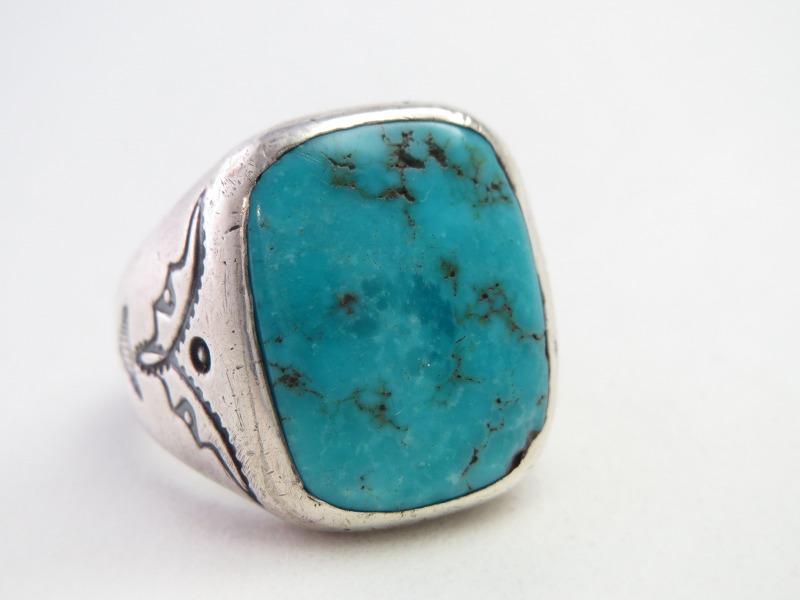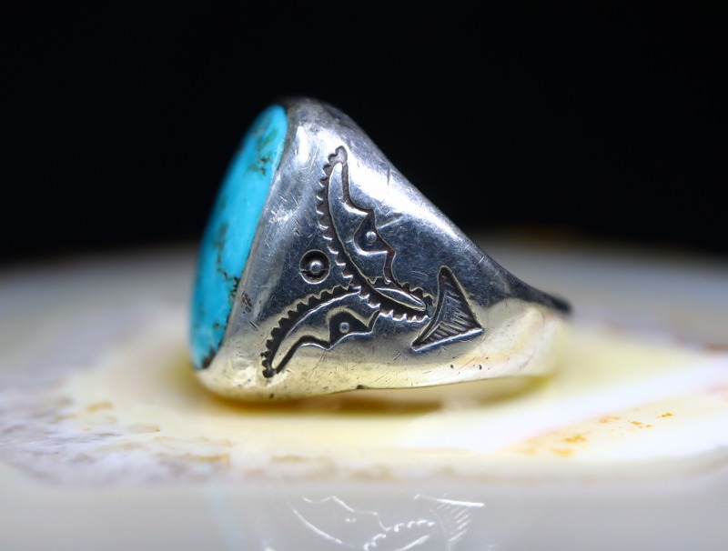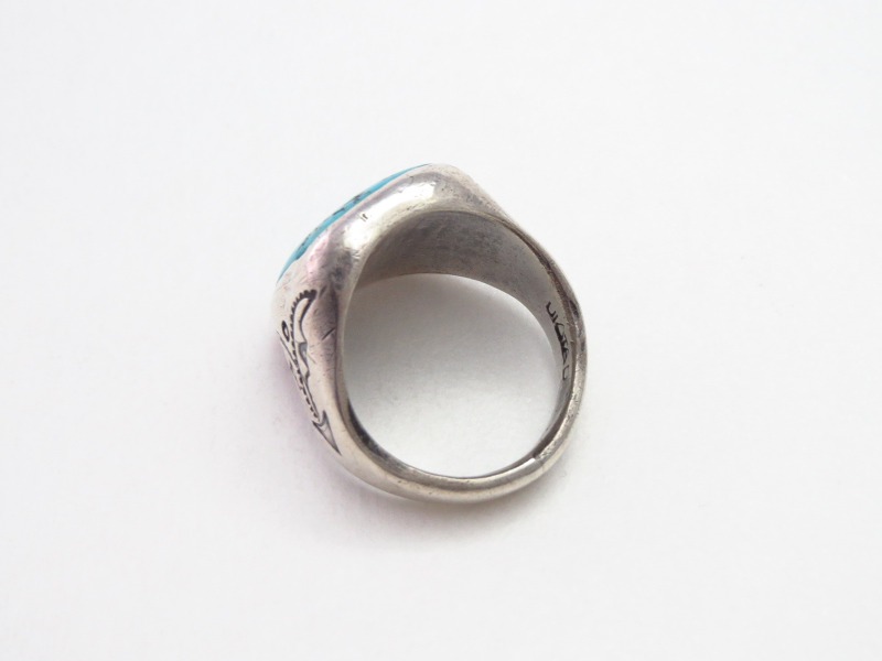一見するとキャストによって作られたように見えますが、内側のエッジに確認できるロウ付けの跡から、量産に向いたキャスト(型を使った鋳物)ではなく、地金製法の一種であるボックス構造で形作られたリングであることが判ります。つまり、シャンクの内側・外側・両サイド・ベゼルをそれぞれ別々に切り出し、サイドのパーツにはスタンプワークを刻んだ後に、それぞれをハンマーワークによって立体的なフォルムに成形、それらの全てのパーツを高度な技術によってロウ付けする事で立体物として作り上げられていることが分かります。さらに、ターコイズのカットに合わせたベゼルが後から加えられて完成しており、とても手間のかかる行程ながら、これらの手順を踏むことによってサイドに施されたスタンプワークは深く力強い打ち込みが可能となり、フェイスはシルバーとターコイズが自然に一体化したようなシェイプを実現しています。