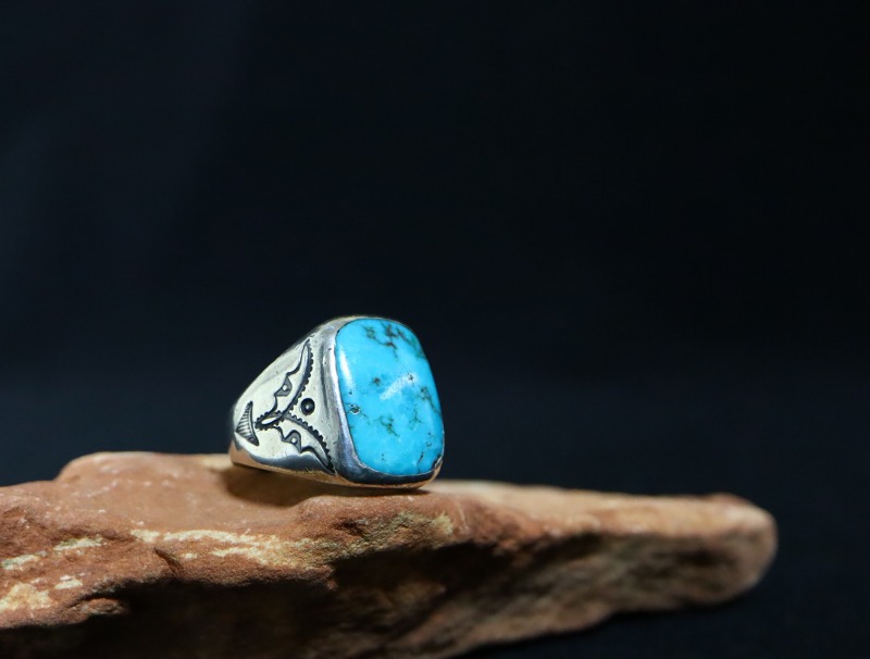 本作もクラシックでシンプルなデザイン/造形のリングですが、伝統的で高度な技巧を要する製法によって形作られたベースに、ナチュラル無添加のターコイズがマウントされたハンドメイド独特の温もりを感じさせる作品となっています。