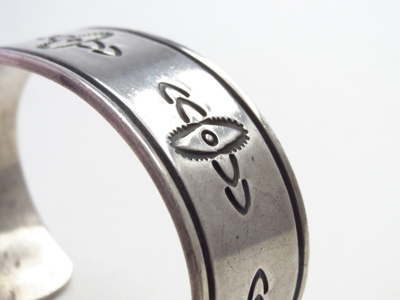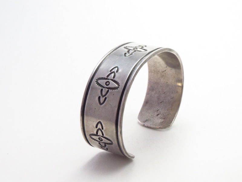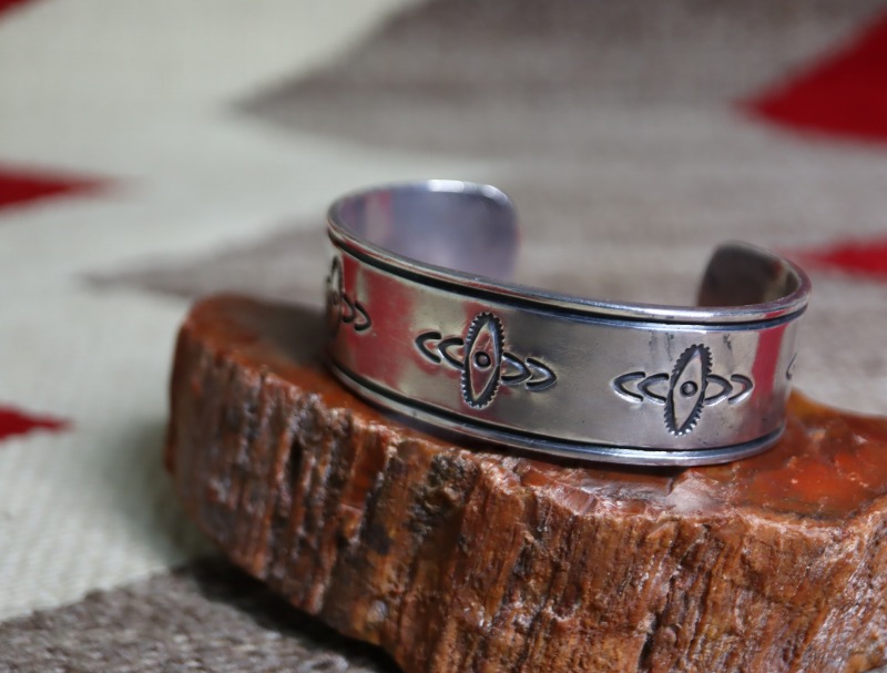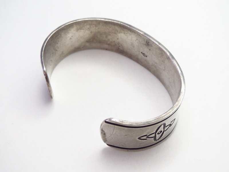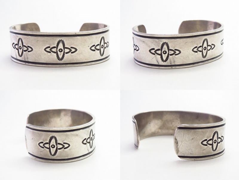 現代では、ナバホのトップアーティストである【McKee Platero】マッキー・プラテロ氏等が、本作のような【Ambrose Roanhorse】アンブローズ・ローアンホース(1904-1982)やナバホギルドが生み出した「古典作品(技術)をベースにモダンで完成されたジュエリー」という理念の影響を強く受けていると思われます。特に初期のMcKee Platero氏の作品では、こちらと同じようなシンプルで簡潔なスタンプワークとファイルワークのみで構成されたピースが散見されます。