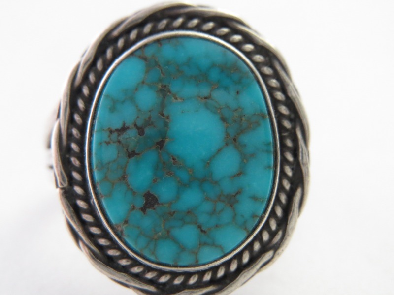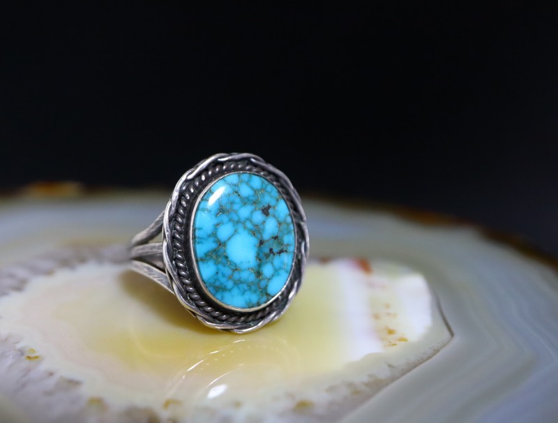 【NAVAJO】ナバホのビンテージジュエリー、大変美しいジェムクオリティターコイズをメインとしたアンティーク/ビンテージリング。性別を問わずご着用可能なサイズのリングで、素朴ながら完成度が高くセンスの良いシルバーワークも魅力的な作品となっています。