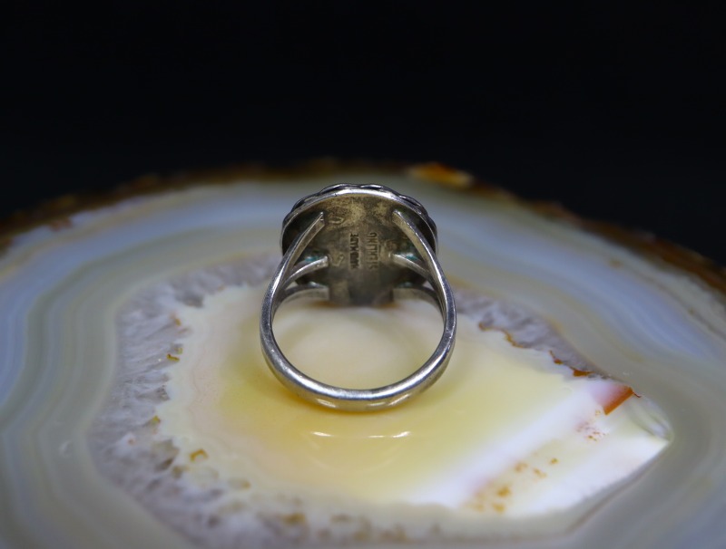 1950年代~1960年代頃の作品と思われ、内側には『HAND MADE』の刻印が刻まれており、とても丁寧な仕事が感じられる作品。おそらくインゴットシルバー(銀塊)から成形されたシャンクは、フロントが『スプリットシャンク』と呼ばれる伝統的な造形で3本に割り開かれており、フェイスに向かって幅とボリューム感を持たせることでフェイスとの自然な繋がりを作っています。