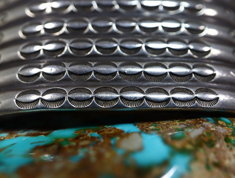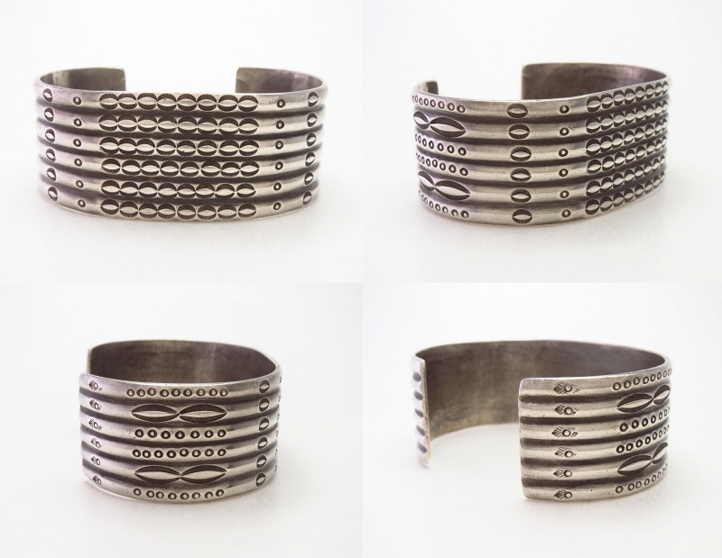 ホピの【Grant Jenkins】グラント・ジェンキンス(1909-1933)の作品や、【Indian Arts & Crafts Board】の中でも【U.S.NAVAJO 2】= 【C. G. Wallace Indian Trader】、同じく【U.S.NAVAJO 40】=【Fort Wingate Indian School】で制作されたピース、そして【The Navajo Arts & Crafts Guild】通称ナバホギルド、その代表を務めた【Ambrose Roanhorse】による作品にも残されていますし、サンタフェに在ったインディアンクラフトショップ【SOUTHWEST ARTS&CRAFTS/Ganscraft】でも類似したバングルが制作されていました。さらに、それらの作品を模倣/サンプリングしたピースが1940年代~1950年代のツーリストジュエリーにおいて散見され、おそらく【Maisel's Indian Trading Post】マイセルズインディアントレーディングポストや【BELL TRADING POST】ベルトレーディングポストによって作られています。こちらの作品も、それらの【Fred Harvey Style】フレッド・ハービースタイルと呼ばれるツーリストアイテムとして量産されたバングルのデザインソース(起源)となった作品の一つであると推測されます。