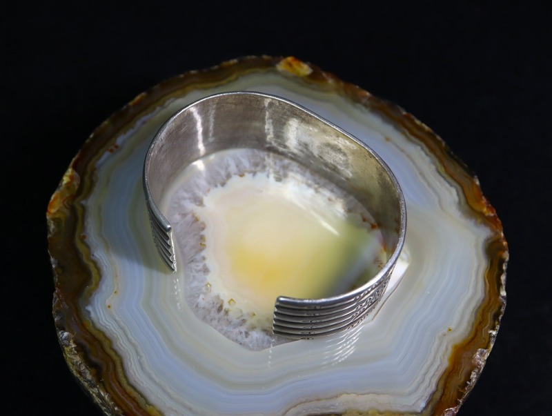 こちらのブレスレットもインゴットシルバーからの成形を含む、全てのディテールが原始的な技術で構成された素朴なアンティークジュエリーですが、手間を惜しまないとても丁寧で完成されたシルバーワークと、アンティーク作品と思えないデザインの洗練度により、アートピース・ウェアラブルアートとしても高く評価できる作品に昇華されています。
