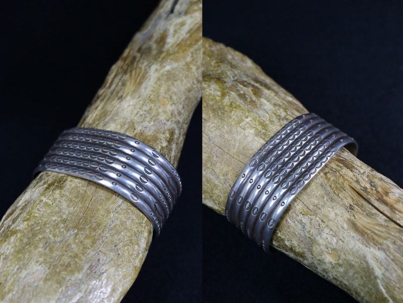 【NAVAJO】ナバホのアンティークジュエリー、インゴットシルバー(銀塊)から成形されたバンド(地金)をベースに、チェイシングやファイルワーク、スタンプワークという伝統技法を駆使する事によって形作られた作品。それらはとてもプリミティブな技法・技術となっていますが、その非常に端正なシルバーワークからは、作者の強い信念やシルバーワークに対する真摯な姿勢まで感じ取れるハイエンドなアンティーク/ビンテージバングルとなっています。