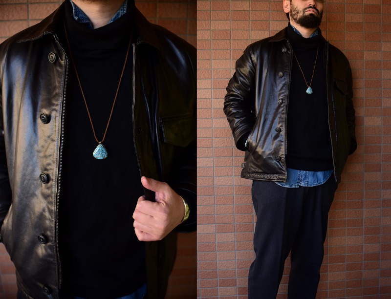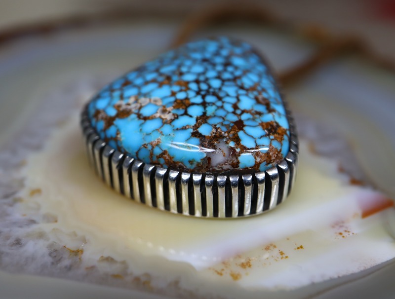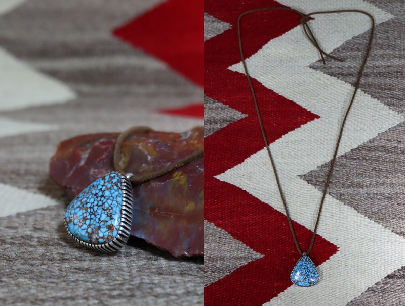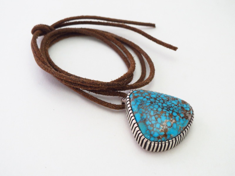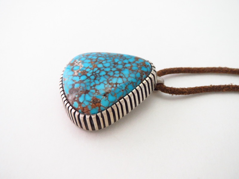 非常に上質で、高さを含めたボリューム感を持ったネバダブルーターコイズをメインとしながら、その石を留めるベゼル(覆輪)に作者のオリジナリティやシルバーワークに対する美意識や信念さえも感じ取れるペンダントトップです。