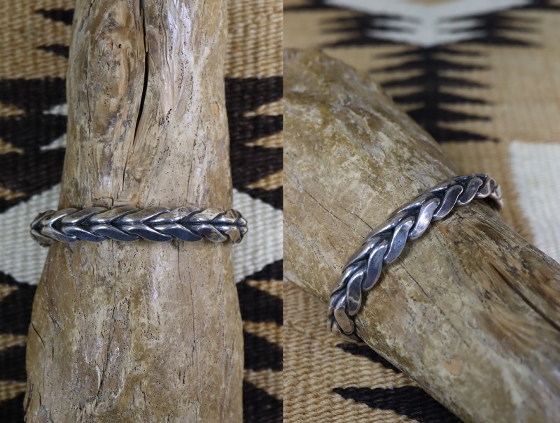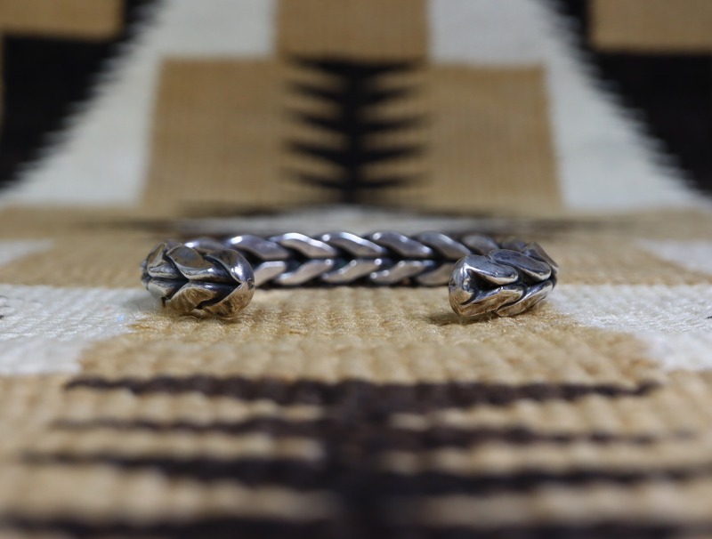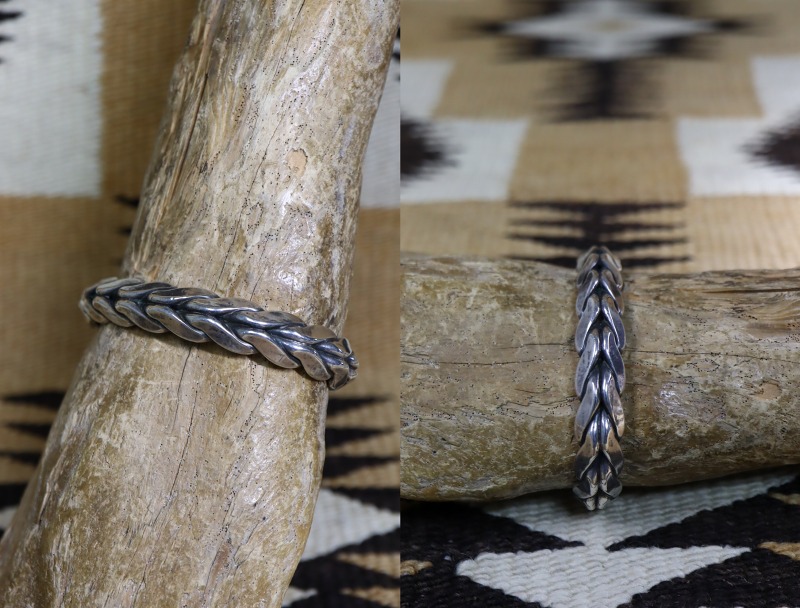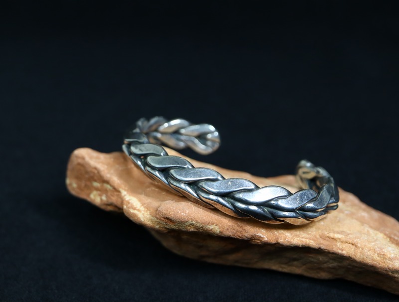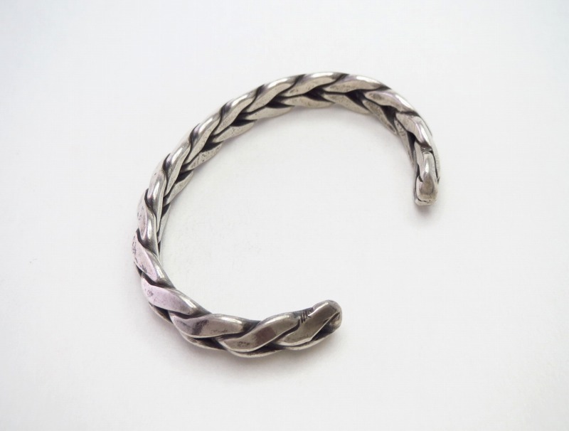 また、言葉では簡単な作業の様に感じられますが、全く同じツイストや、それらを繋ぐための成形等、非常に高度なシルバーワークによって形作られたブレスレットであり、シンプルながらハンドメイドのインディアンジュエリー独特の味わいと技術力を感じることのできる造形となっています。