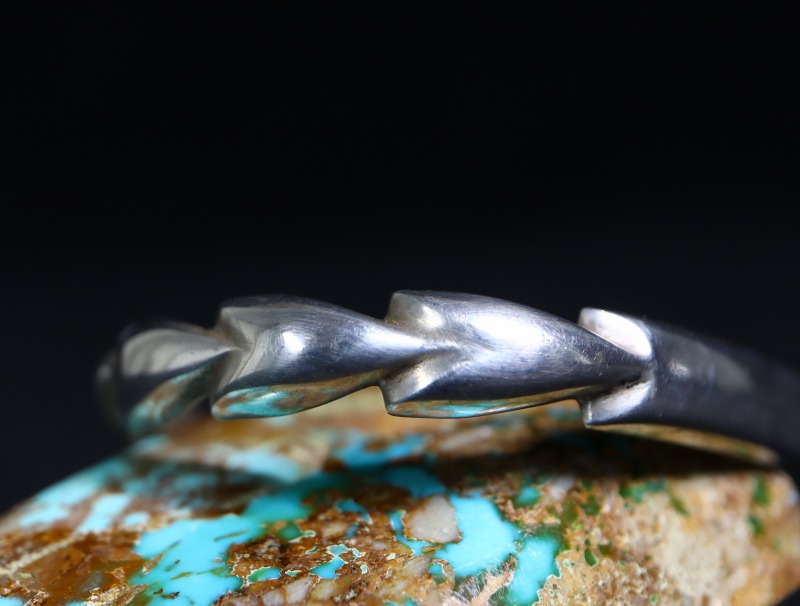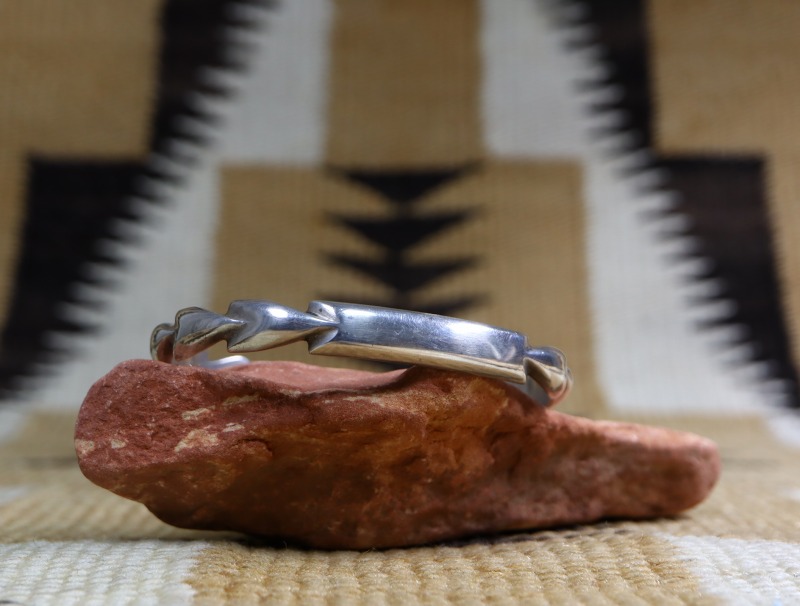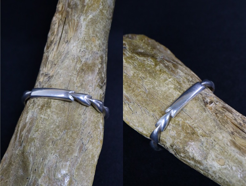 また、細い幅でありながら30gを超える重量を持ち、シンプルながらとても立体的な造形/デザインとなっています。サイド~ターミナル(両端)にかけては、アローヘッドを連続して並べた様な独特な立体造形が施され、フロント部分はフラットなシェイプに造形されたデザイン。他にもサイド~ターミナルがハーフラウンドやトライアングル型等の断面に造形され、フロント部分に長方形の長いパネルが作られた造形スタイルの作品を総称して『フラットトップ』と呼ばれています。このような立体物として美しくとても手の込んだ造形は、特にアンティークインディアンジュエリーディーラーの間で人気が高く、市場に出ないアイテムとなっています。本作は、それらを踏襲したデザインをサンドキャストによって蘇らせたブレスレットであり、強い特殊性は感じませんが、さり気なくも素晴らしい造形センスによって形作られた作品です。