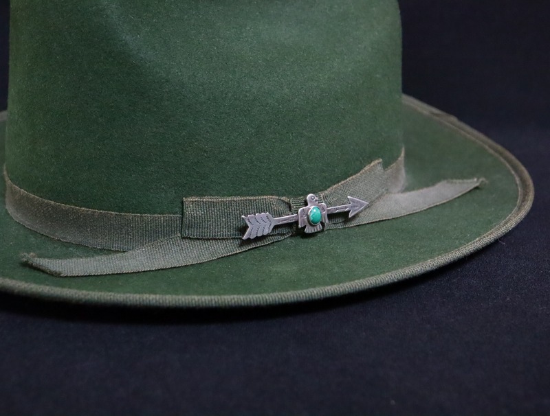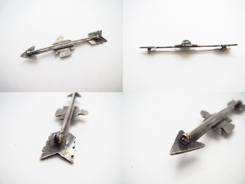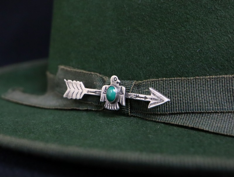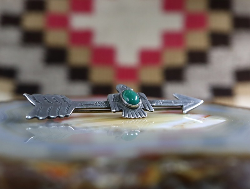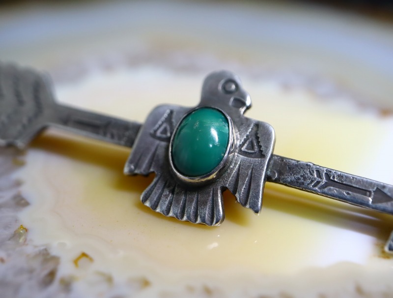1930年代~1940年代頃のピースと思われ、ツーリストジュエリーを代表するモチーフであるアローとサンダーバードシェイプがキャッチーな印象のピン。使いやすいシェイプとサイズ感で、サンダーバードのセンターには、グリーンターコイズがマウントされており、さり気なくも存在感を発揮する立体的で動きのある表情を作っています。