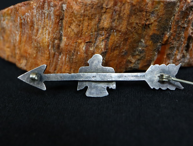 【Fred Harvey Style】フレッド・ハービースタイルや【Tourist Jewelry】ツーリストジュエリーと呼ばれる、20世紀前半頃にアメリカ中西部の観光客向けに制作されたスーベニアアイテム(土産物)の一つ。アローシェイプにサンダーバードがアップリケされたキャッチーな印象のアンティーク/ビンテージピンブローチです。