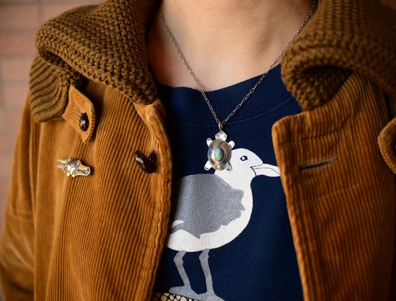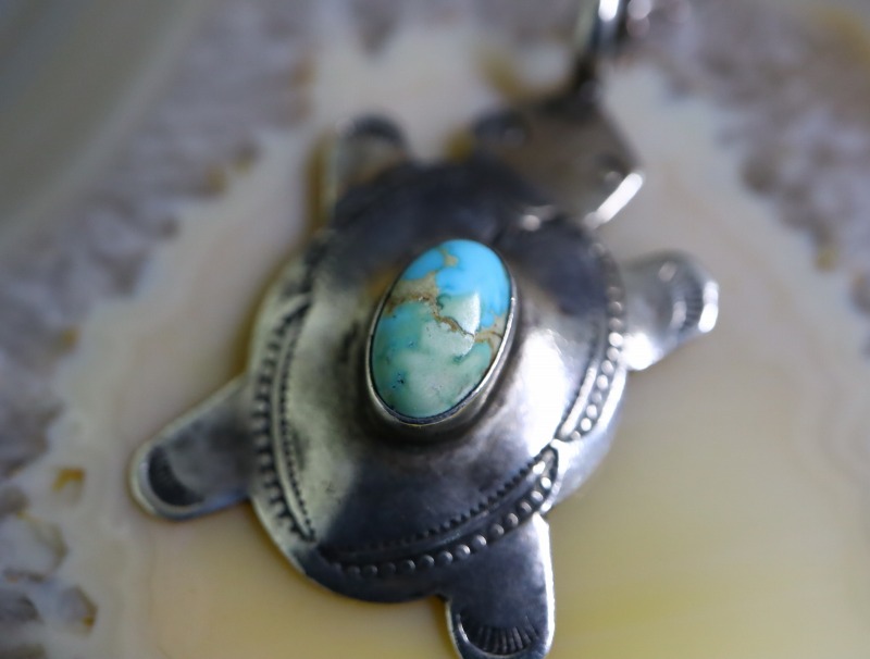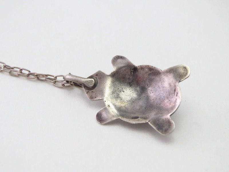 【ZUNI】ズニか【NAVAJO】ナバホのアンティークジュエリー、丸いフォルムがとても愛らしいタートル/トータスモチーフに、綺麗なターコイズがマウントされた作品。全ての工程が伝統的なハンドメイドで仕上げられ、性別やスタイルを問わずさり気なく使いやすい印象のアンティーク/ビンテージネックレスです。