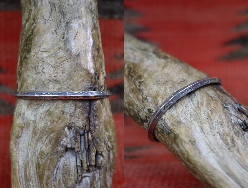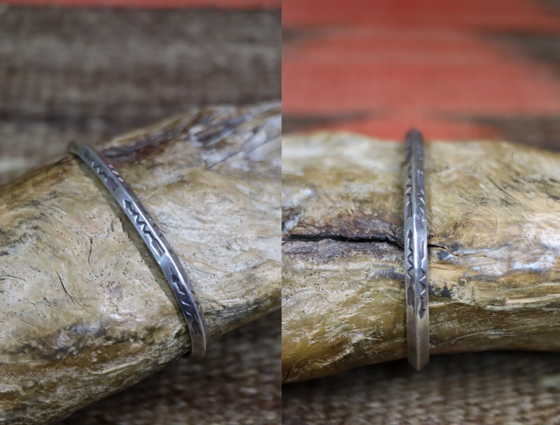 その様な原始的な技術で形作られた武骨なバンドに、ナバホジュエリーらしいアローモチーフの亜種ライトニングアロー(ジグザグにデザインされた矢型)のスタンプワークが三角形の上下で逆方向に連続して刻印されています。そのオーセンティックでシンプルながら独特なスタンプワークの構成により、とても現代的で洗練された印象へと昇華されているようです。