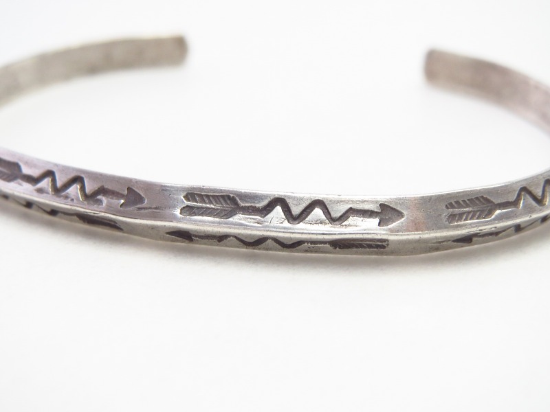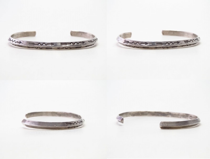 【NAVAJO】ナバホのアンティークジュエリー、細いトライアングル(竜骨型)ワイヤーをベースとしたシンプルでオーセンティックな造形スタイルの作品。ライトニングアローのスタンプ/刻印が羅列された、プリミティブながら洗練されたデザインが魅力的なアンティーク/ビンテージバングルです。