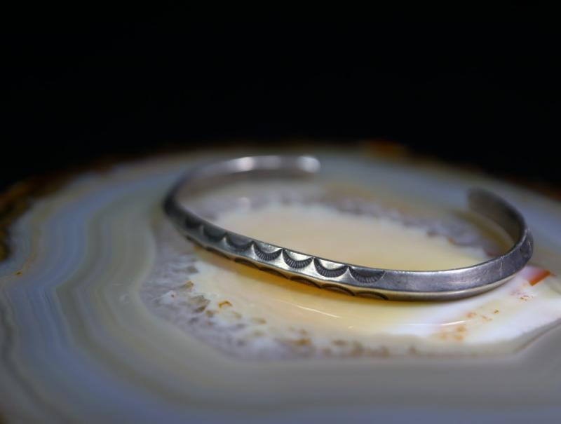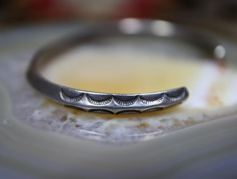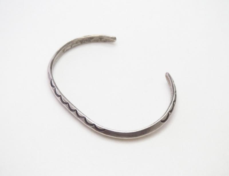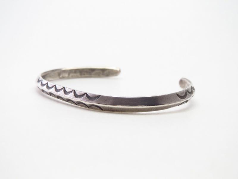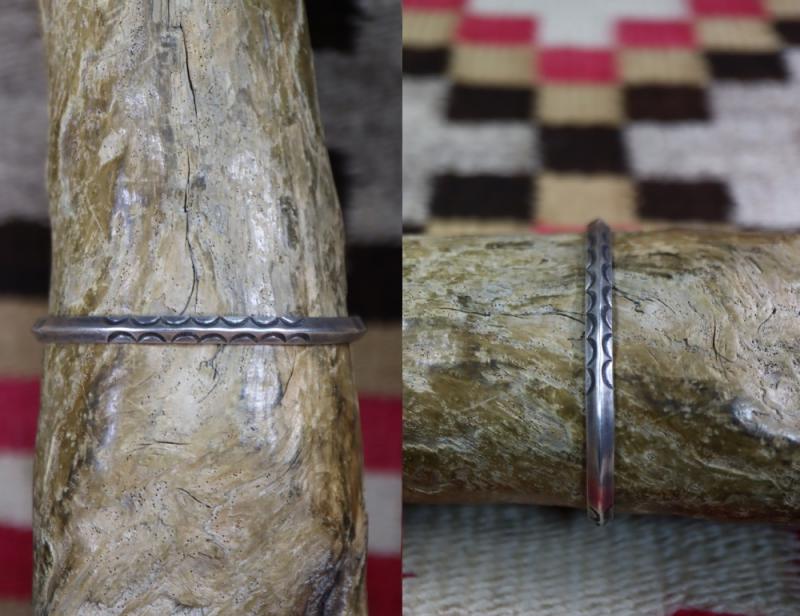 【NAVAJO】ナバホのアンティークジュエリー、インゴットシルバー(銀塊)から成形された、細身ながら硬く重厚なトライアングルワイヤー(竜骨型)をベースに、プリミティブで力強いスタンプが施されたとても古いアンティーク/ビンテージバングルです。