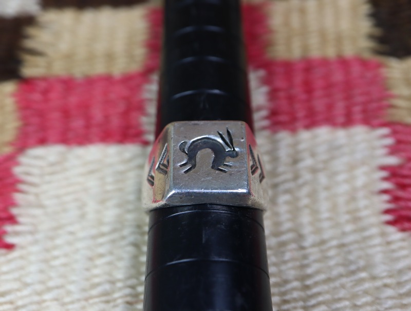 また、サイドにはスタンプワークが深く刻まれており、さり気なくもインディアンジュエリーらしい表情を与える、効果的なシルバーワークとなっています。オーバーレイによって描き出されたラビットのデザインは、キャッチーで愛らしい印象がありますが、重厚なシルバーワークやクラシックなリングのシェイプなどはチープな印象を持たず、アンティークインディアンジュエリー独特の雰囲気と存在感を生み出しているようです。