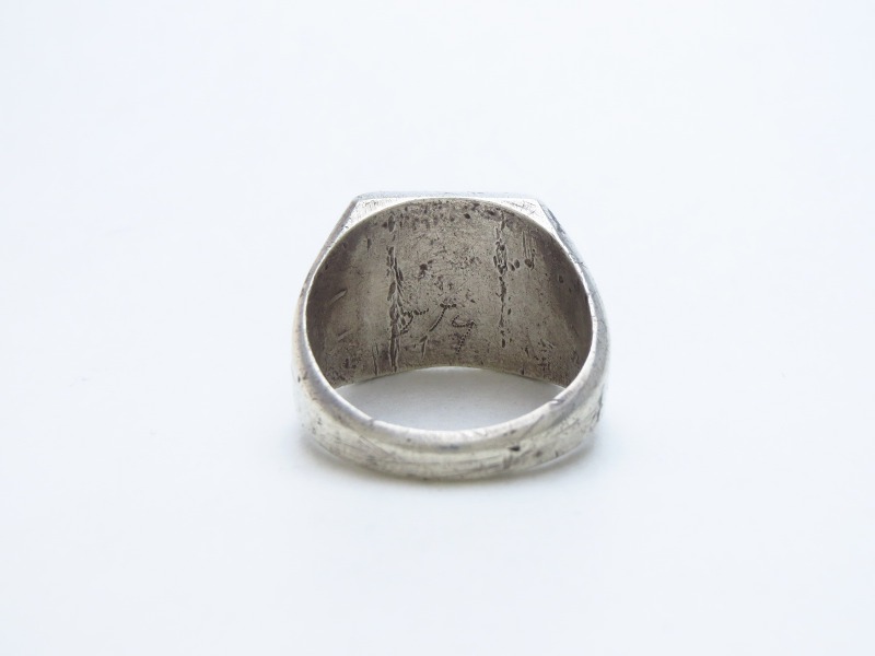サンドキャストにより成形されたシャンク/地金は『シールリング』と呼ばれる重厚な印台型をベースに、フェイスのみオーバーレイによって構成されています。またそのオーバーレイは、現代の作品とは異なった厚いシルバーをカッティングしてオーバーレイされる事により、深く強い影によってラビットが描き出されており、立体感と奥行きが与えられています。さらに、現代のオーバーレイ作品に見られるような下地となるシルバーへのテクスチャー(スタンプやエングレイビングによる表面加工)も施されていない時代の作品となっています。