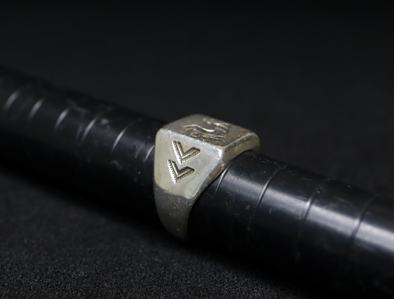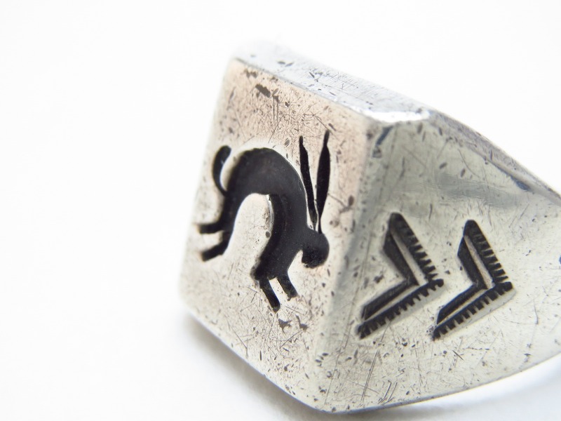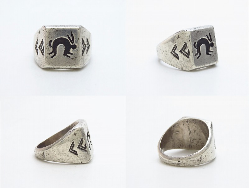 【HOPI】ホピか【NAVAJO】ナバホの作品で、オーバーレイによってとても珍しいラビット/バニーモチーフが描かれたアンティーク/ビンテージリング。印台型の重厚でクラシックなシェイプをベースに、スタンプワークも施されたビンテージインディアンジュエリー独特なシルバーワークも特徴的な作品となっています。