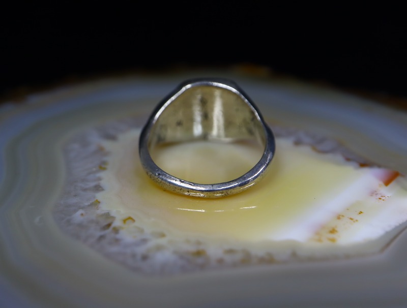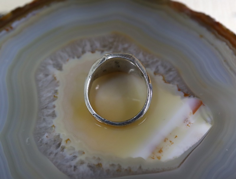 ある程度キャストで成形されたと推測されるシャンク/地金は、『シールリング』と呼ばれる印台型をベースに、フェイスのみオーバーレイによって構成されており、サイドには削る技術であるファイルワークやスタンプワークによって、彫りが深く立体的なシルバーワークが施されています。