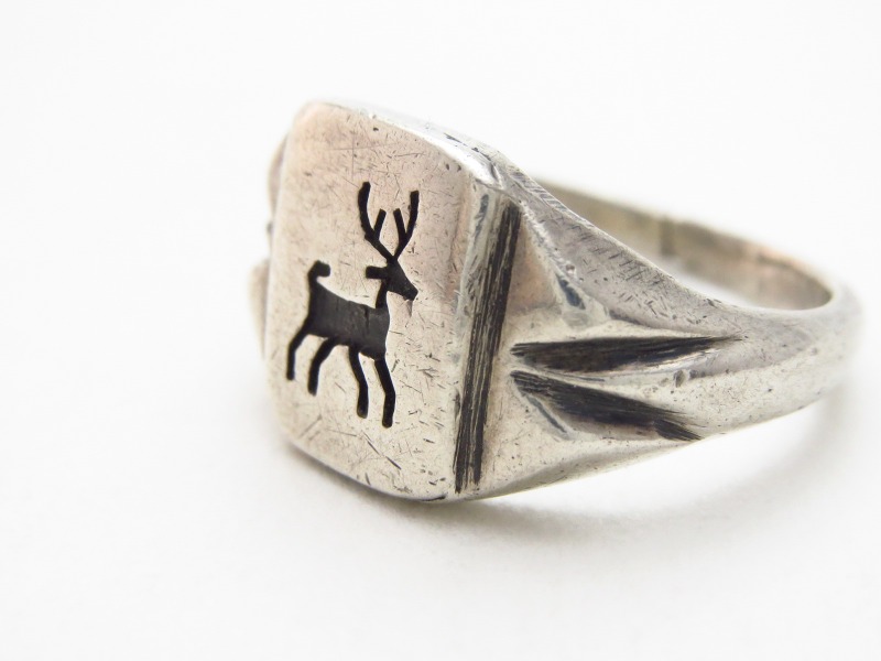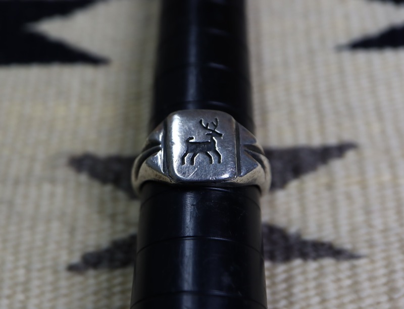【HOPI】ホピか【NAVAJO】ナバホの作品で、シールリング/印台型のクラシックでシンプルな造形をベースとし、フェイスにはオーバーレイによってエルク(鹿)モチーフが描き出されたアンティーク/ビンテージリング。1940年代以前のクラスリング(カレッジリング)にも近いフォルムは、古代のジュエリーの様なプリミティブな風格と、モチーフや細部から漂うビンテージインディアンジュエリー特有の魅力も帯びた作品となっています。