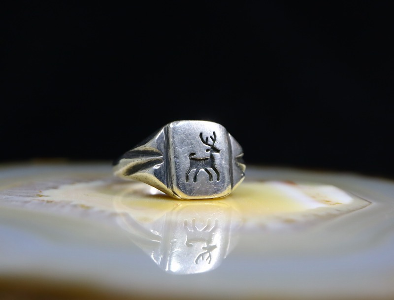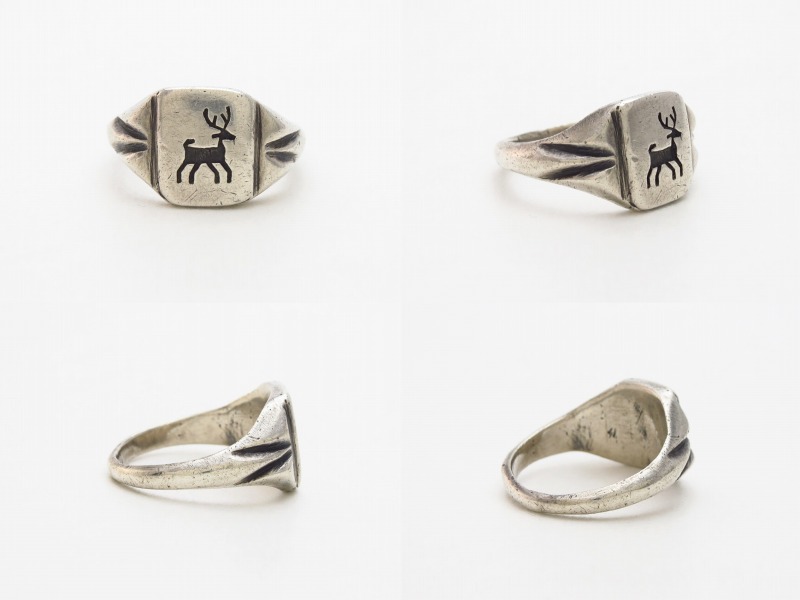 また、比較的希少なメンズサイズのピースで、オーセンティックなシールリングのシェイプはクラシックなイメージを持っていますが、描かれているポップなイメージのエルクは、男性向けのアクセサリーに重要な要素である『ギャップ』と『遊び心』を与えてくれるアイテムであり、さり気なくスタイルに奥行きをもたらすことが出来るリング。ビンテージ感のある渋い質感やシルバーのみで構成された素朴な表情もナチュラルで使いやすい作品です。
