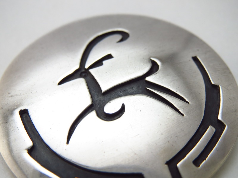 本作でも躍動的なプロングホーン(アンテロープ)と、それに反して2次元的で幾何学的にデザインされた文様が融合し、不思議な調和を生み出すデザインとなっています。また、プロングホーンの目の部分のみがスタンプワークによって描かれており、現代のオーバーレイ作品の様な、下地のシルバーにたするテクスチャー(スタンプやエングレイビングによる表面加工)が見られません。このようなディテールはオーバーレイ技法の黎明期の特徴であり、このようなディテールにより、現代の作品よりも素朴でクリーンな印象となっているようです。