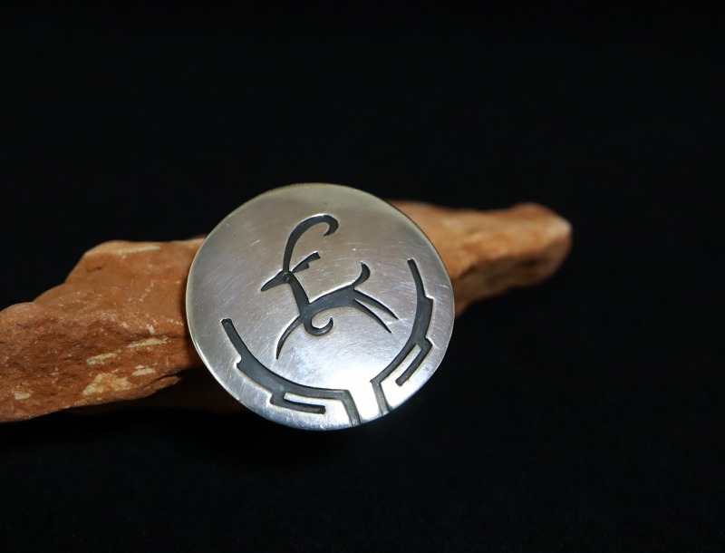 1950年代前後に作られた作品と思われ、オーセンティックなラウンドシェイプをべースに精巧なオーバーレイ技法により、立派な角や機敏な動きが特徴のプロングホーンがデザインされており、下部に構成された幾何学模様と組み合わされた図案様式は、サンイルデフォンソやホピ、アコマ等のプエブロ絵画や焼物に見られる特徴を備えています。その具象と2次元的な文様を組み合わせた独特な絵画・図案様式は、1930年代頃にとても新しい表現としてアメリカ・ヨーロッパでも高く評価されました。その図案化された文様は自然の摂理や営みを独自に解釈し、可視化・表現したものです。