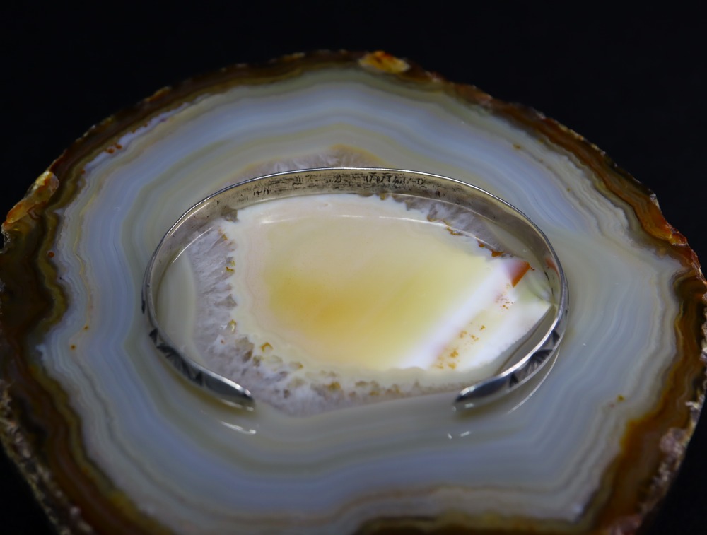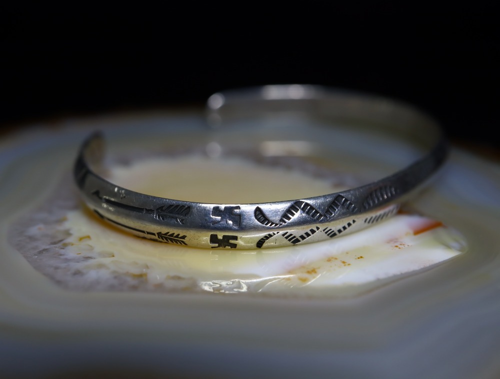 さらに、上下対称に逆卍やアロー等のスタンプワークが施されており、ターミナル(バングルの端)のエッジは丸く鞣されています。