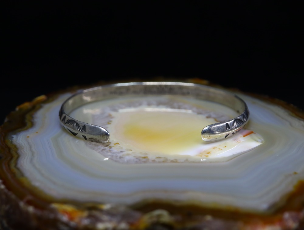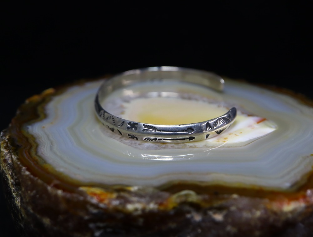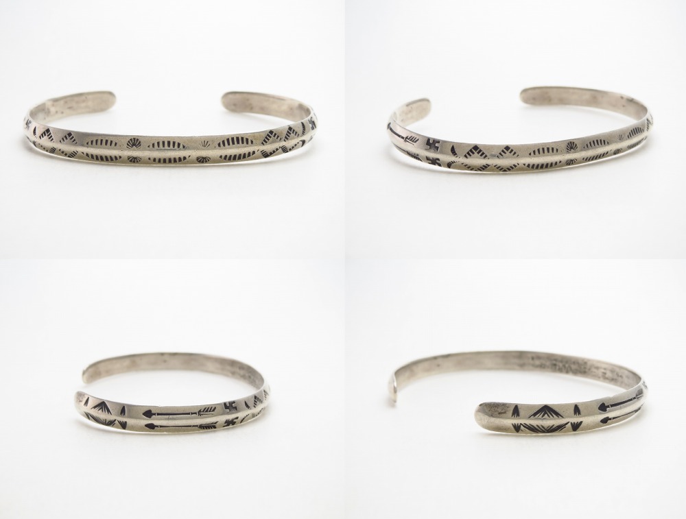 これらの製法や造形スタイルからは、ツーリストジュエリーの中でも古い作品と推測する事が出来ます。また、初期のツーリストジュエリーである為、具体的なモチーフがアロー以外には見られず、スタンプ(鏨)は抽象的なモチーフとなっていますが、連続して構成されることでプリミティブな中に、どこか洗練された印象も感じさせます。
