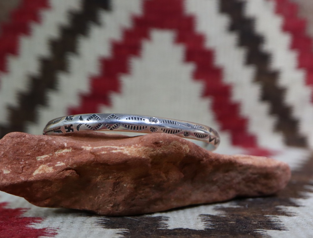 【NAVAJO】ナバホのアンティークジュエリー、ナローなトライアングルワイヤー(竜骨型)のバンド/地金をベースに【逆卍】Whirling Log/Nohokosやアロー等のスタンプワークが刻まれた作品。このような幅のブレスレットにおいては珍しい大きめサイズのアンティーク/ビンテージバングルです。