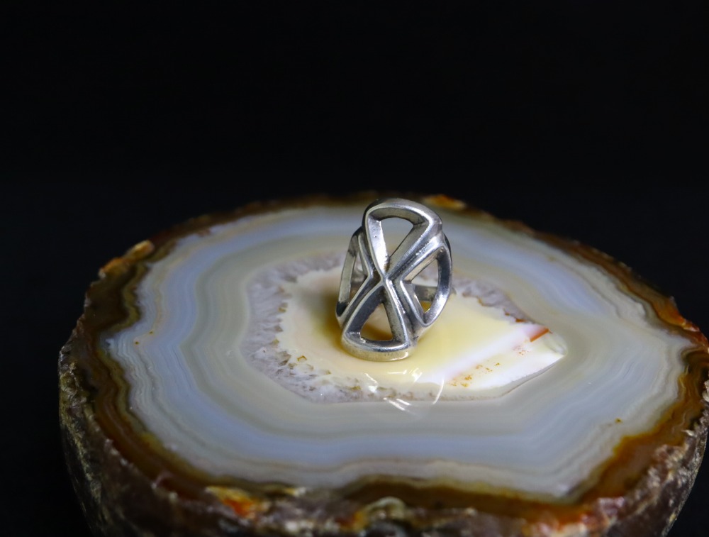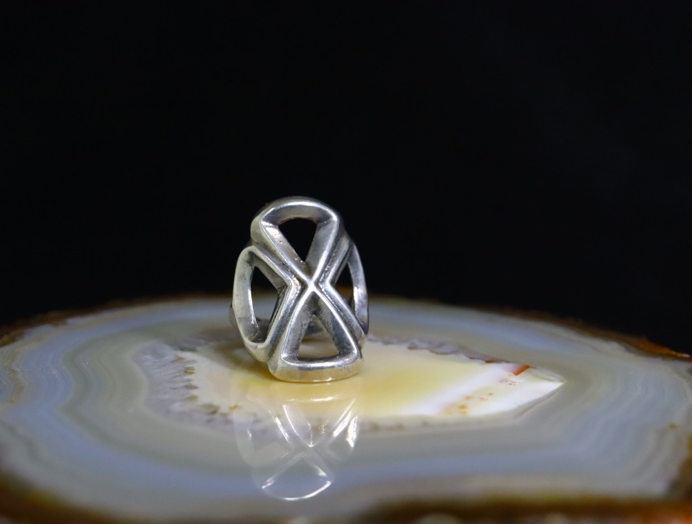 その後、1943年に【Horned Moon/ホーンドムーン】と呼ばれる空を司る精霊をモチーフとしたシンボルが、ナバホギルドの象徴として商標登録されており、諸説ありますが1940年代後半頃からホールマークとして作品に刻印されるようになったようです。1950年代以降になってからは『NAVAJO』の文字や、銀含有率92.5%の地金であることを示す『STERLING』の刻印が追加されていきます。