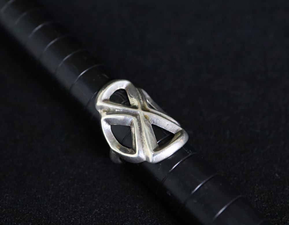 デザイン/造形は、トライアングル(竜骨型)の断面を基本とした造形となっており、フェイスには4つの三角形を組み合わせることで、アイアンクロスの造形が生み出されています。シンプルながら立体的で計算されたデザインが美しいリングとなっており、ワイドなリングながら肌が透けるデザインによって指に馴染みの良いリングとなっています。