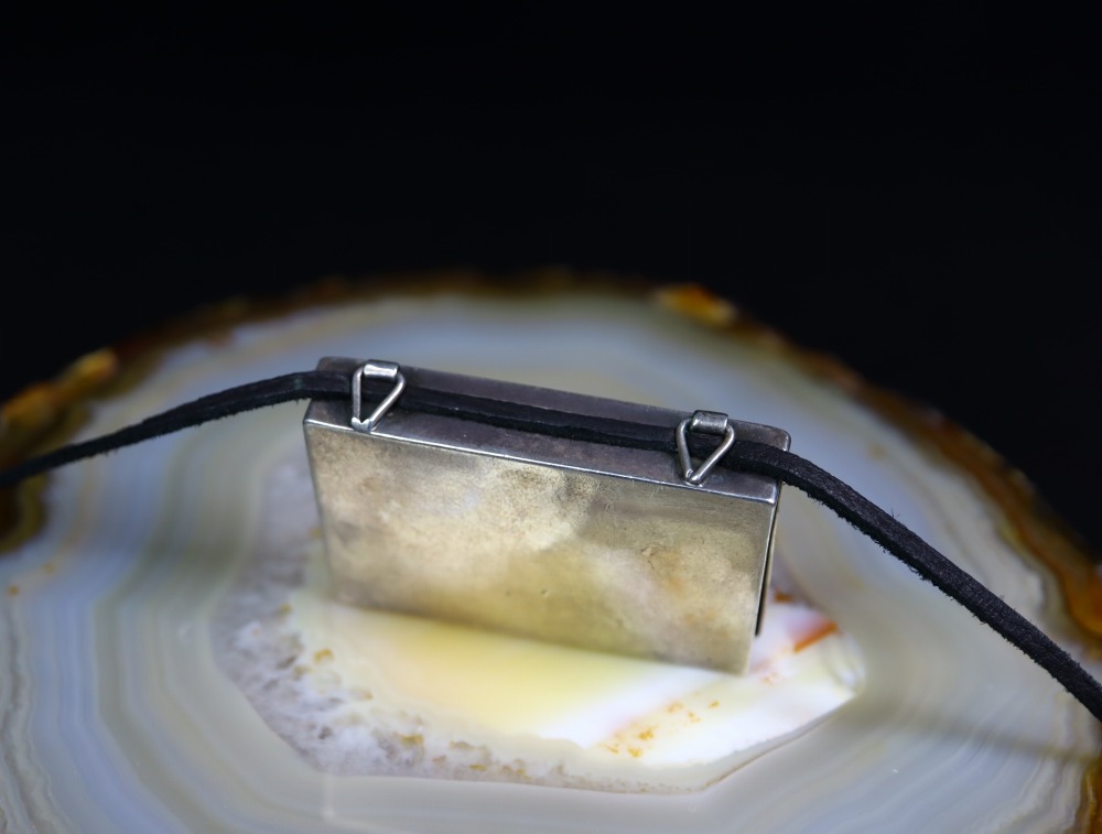 非常に精巧に作られたボックスがトップになることで、ミニチュアのハンドバックやスーツケースを身に付けているような愛らしさと、ナバホジュエリーらしいスタンプワークによるエスニシティで味わい深いな表情が高次元で調和した作品となっています。