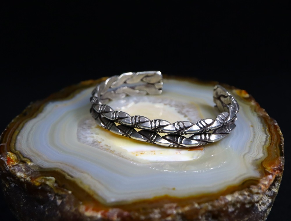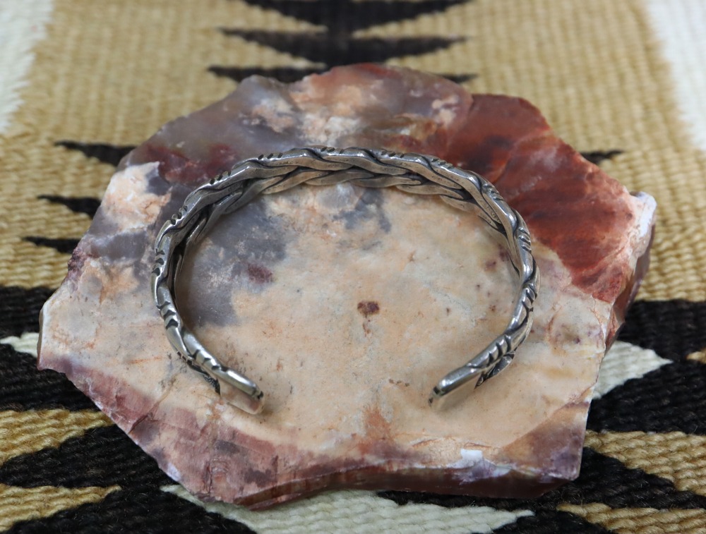 1930年代中頃~1950年代頃に制作された作品と思われ、インディアンジュエリーの中でも最初期からみられるスタイルの一つであるツイステッドワイヤーを、同じく伝統的なシェイプであるトライアングル(竜骨型)に仕上げたバンドのブレスレットです。