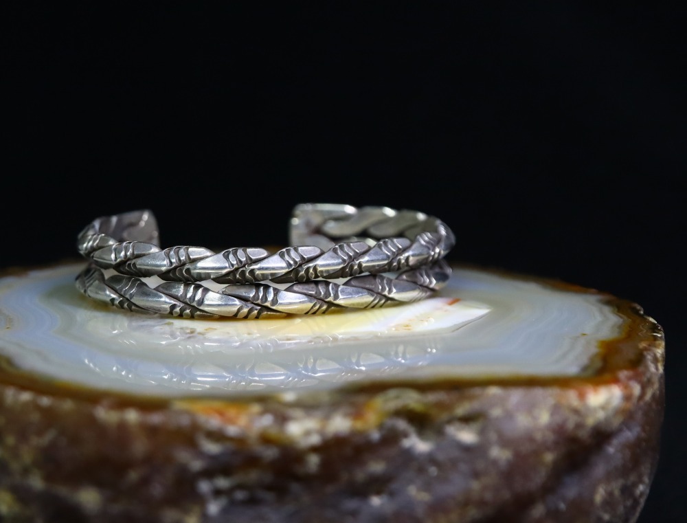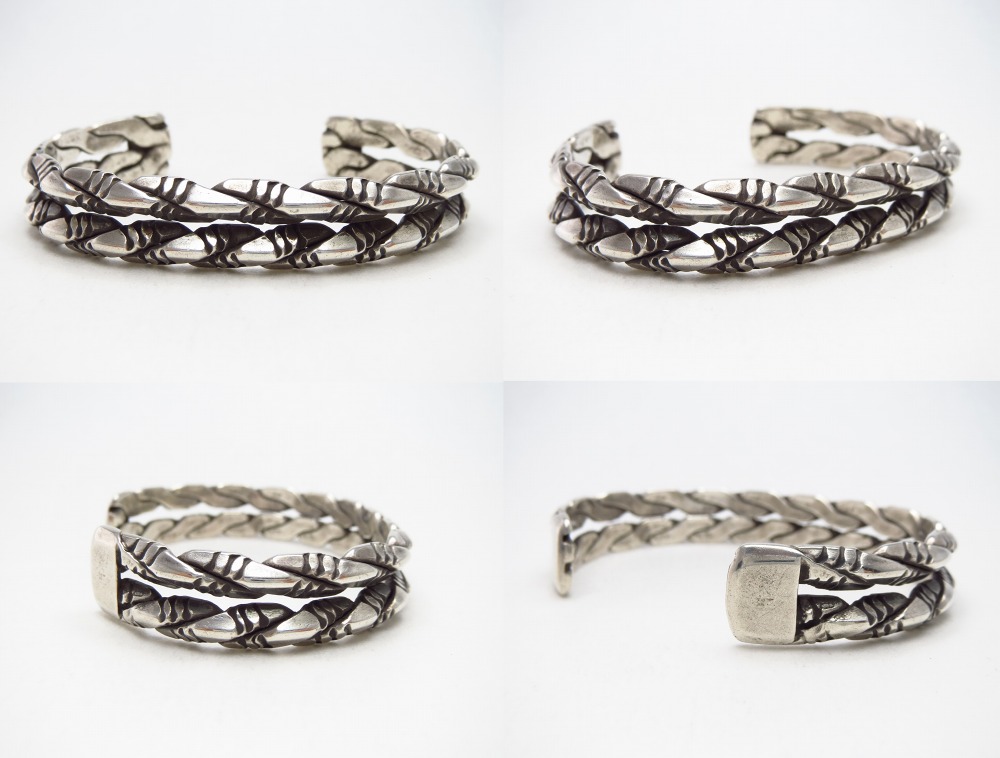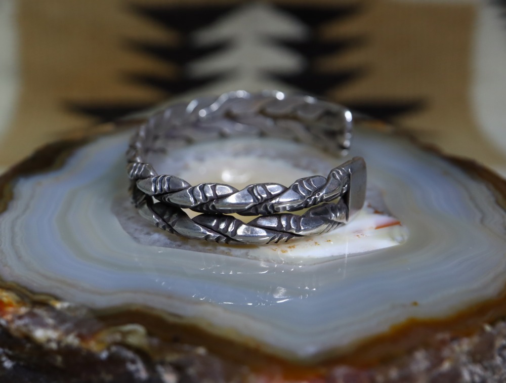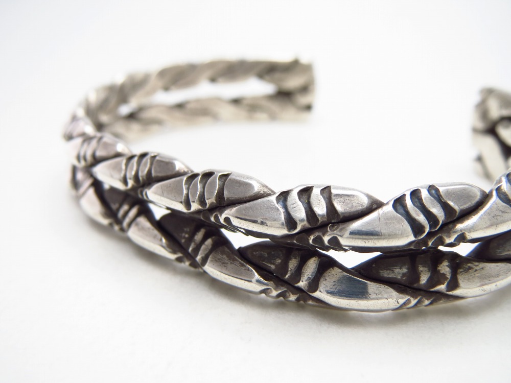 この様な造形は、一度ツイステッドワイヤーを制作してから木に彫り込んだトライアングルの溝や金型の溝にハンマーで叩き込むことで成形しており、シンプルながらハンドメイドのインディアンジュエリー独特の味わいと技術力を感じることのできる造形スタイルです。