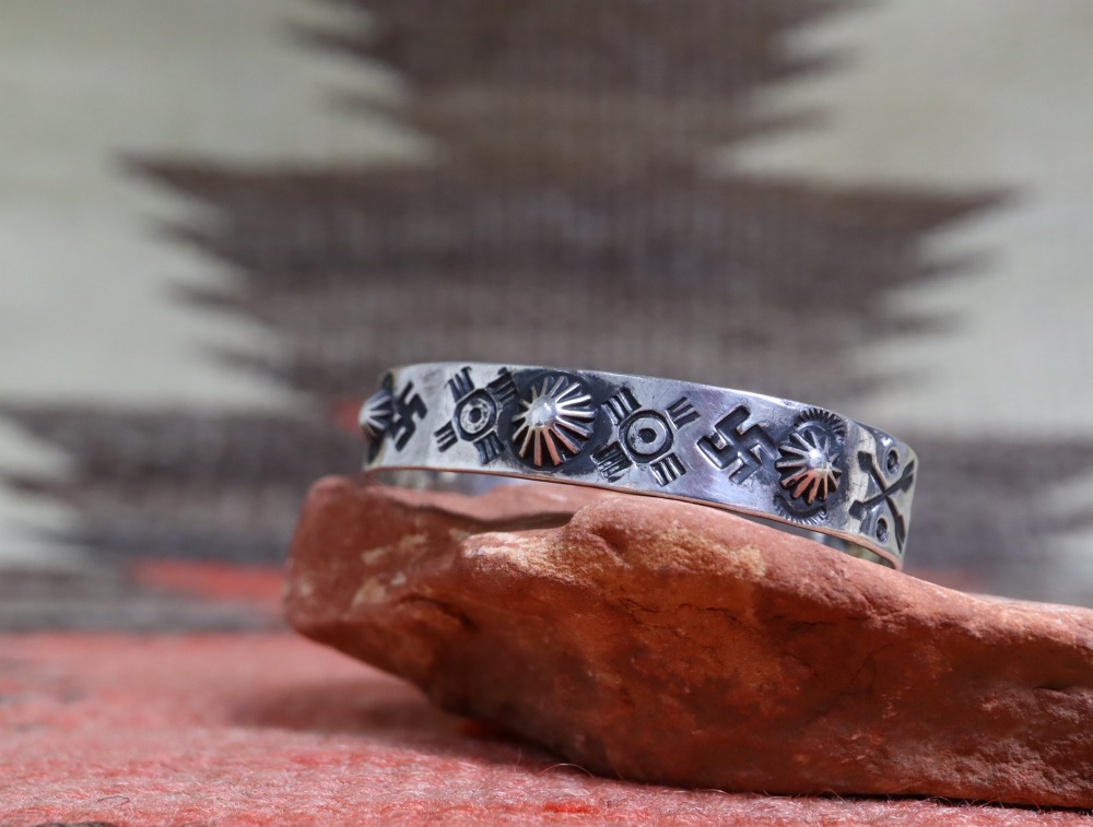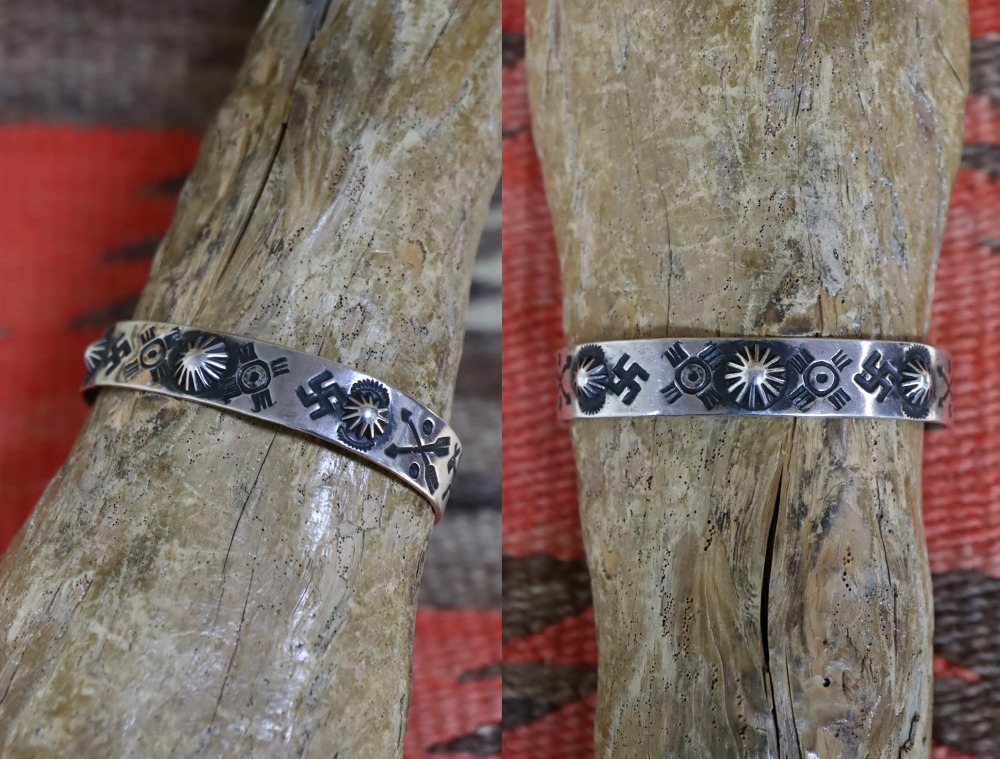 さらに、幸福を意味するサン/太陽シンボルや、【逆卍】Whirling Log等と共に、クロスアローやホース/馬モチーフ等の少し愛らしいイメージのモチーフも刻まれる事でキャッチーで複雑な表情に仕上げられたブレスレットです。