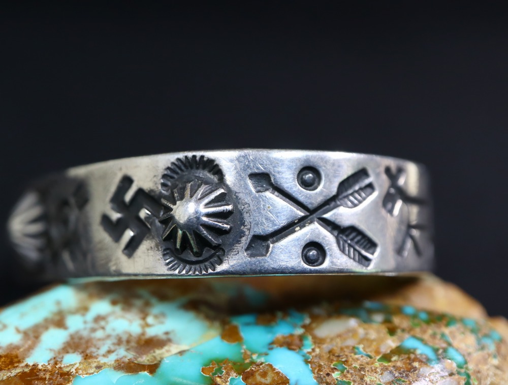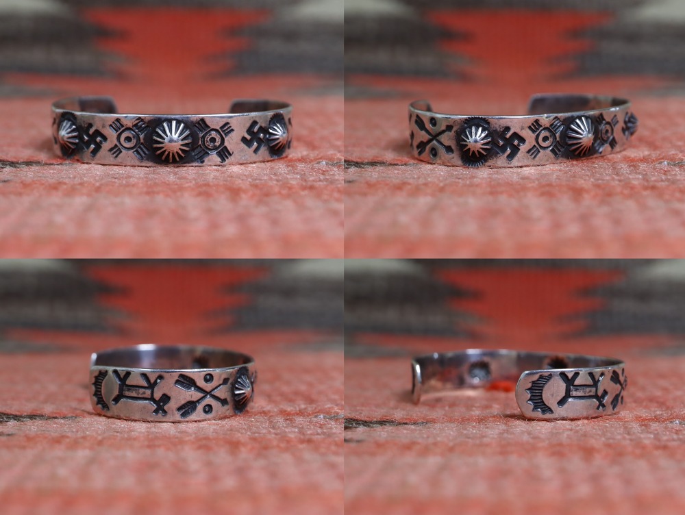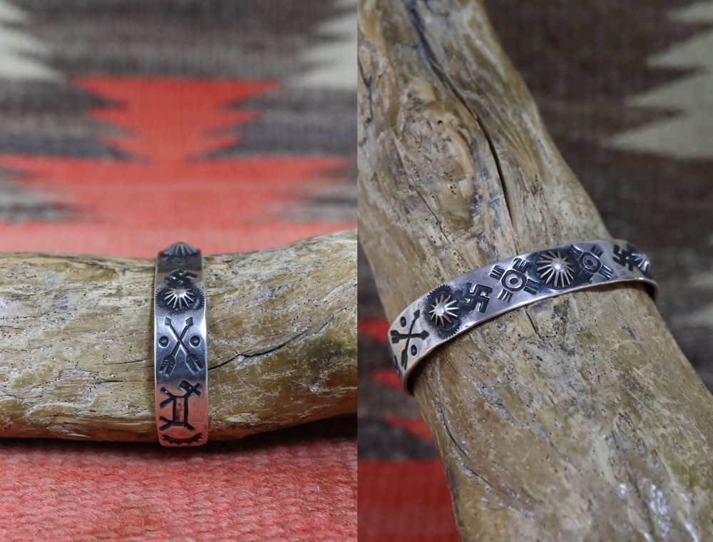 【Fred Harvey Style】フレッド・ハービースタイルや【Tourist Jewelry】ツーリストジュエリーと呼ばれる、20世紀前半頃にアメリカ中西部の観光客向けに制作されたスーベニアアイテム(土産物)の一つ。中でも当時有名工房の一つであった【Arrow Novelty】アローノベルティ社製のアンティーク/ビンテージバングルです。