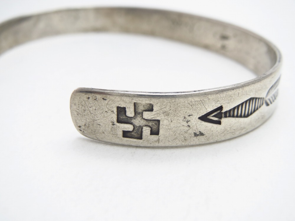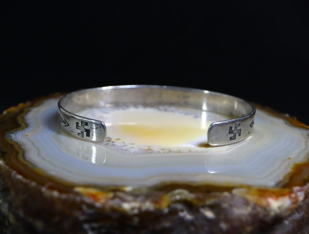 【逆卍】Whirling Log等のスタンプワークが施されたピースで、細いバンドではとても珍しい大きいサイズのアンティーク/ビンテージバングルです。