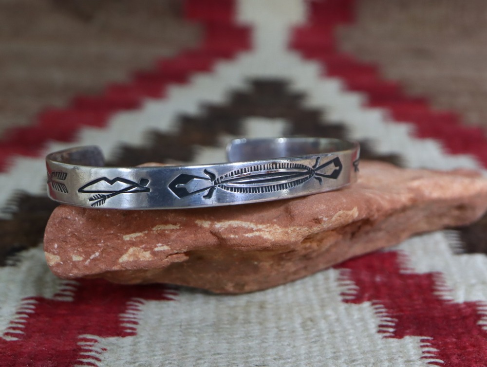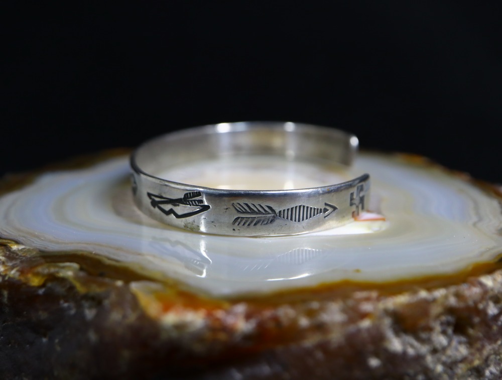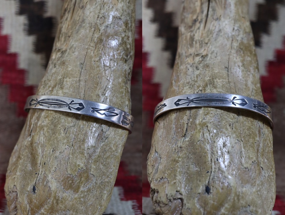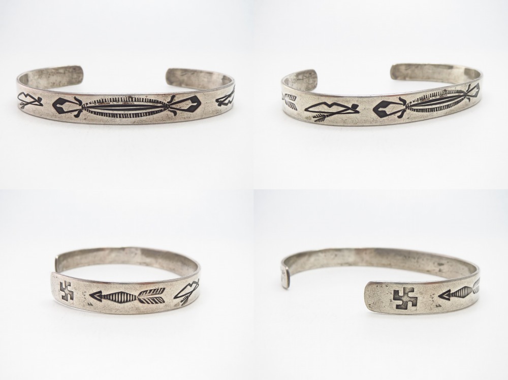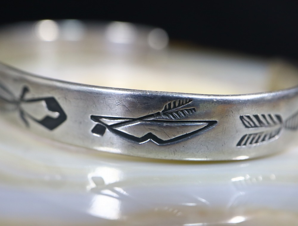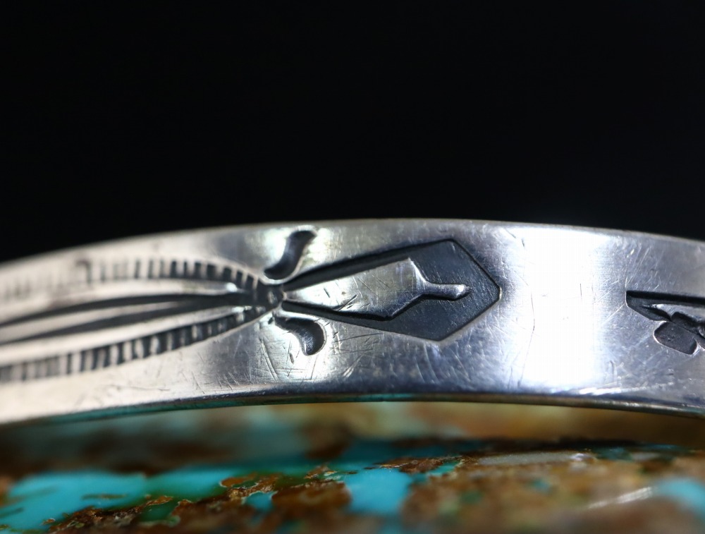 そのバンドの全体に、アローやプエブロのポッテリー(焼き物)においてフェザーを表すモチーフ、逆卍等のアンティーク作品らしい味わい深いスタンプワークが施されています。