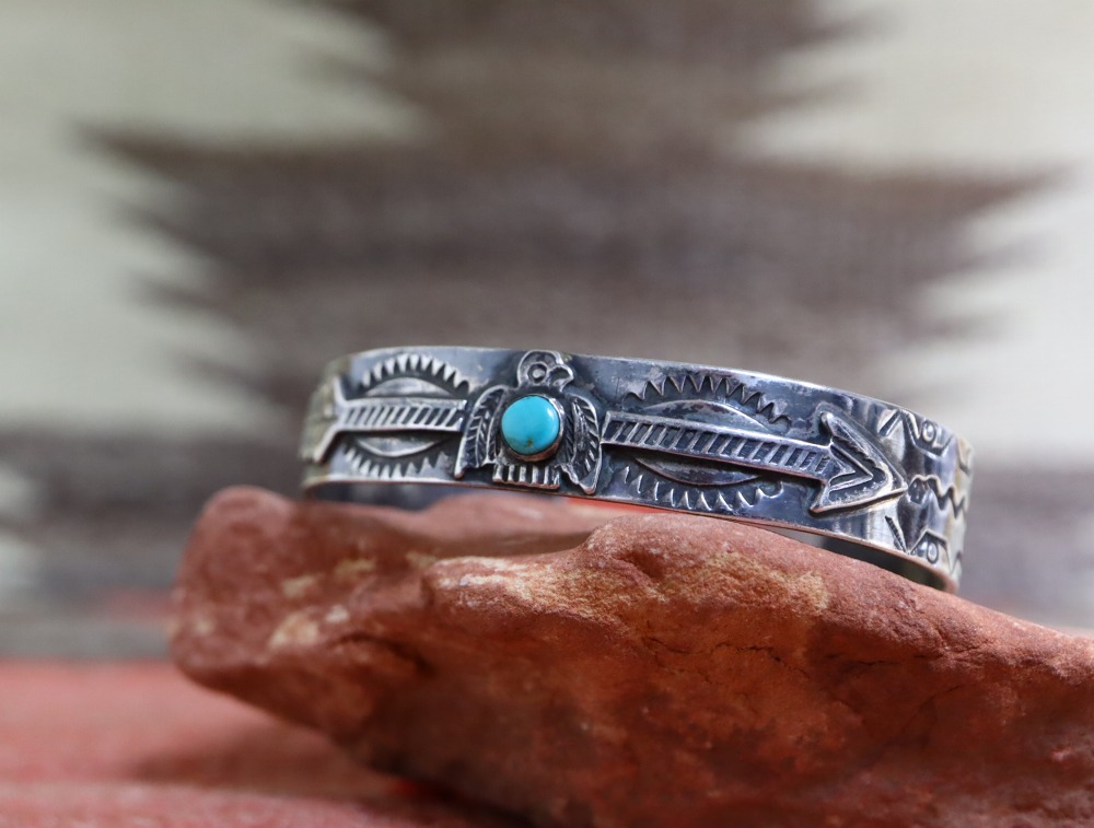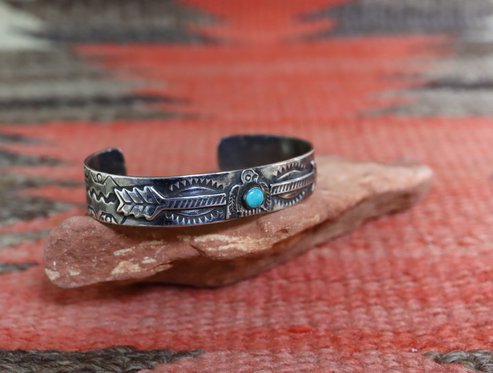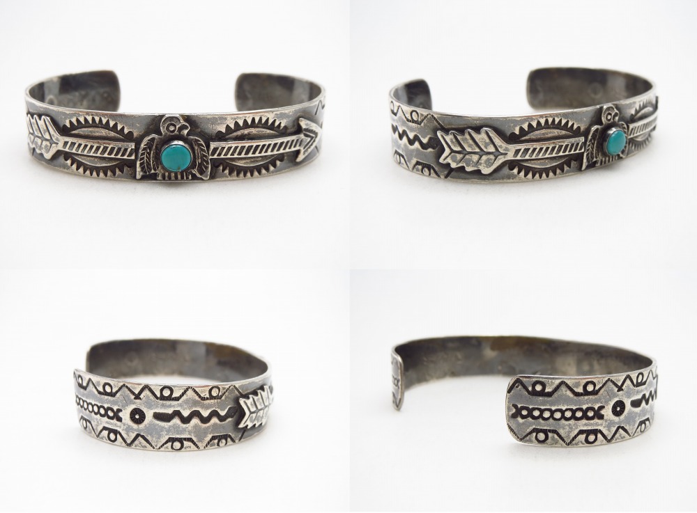 センターに大きく構成されたアローと、愛らしいサンダーバードのアップリケが特徴的で、全体にとてもデザインのバランスが良く、比較的小さいサイズのブレスレットとなっています。