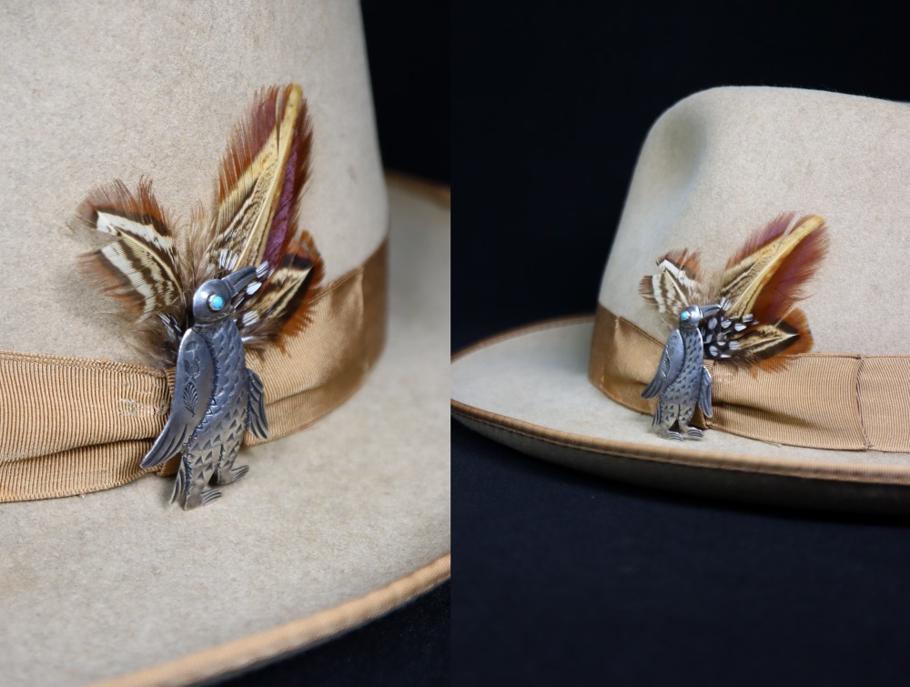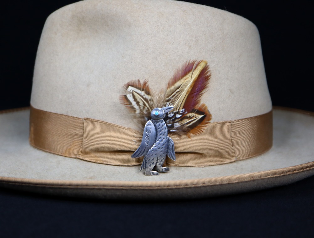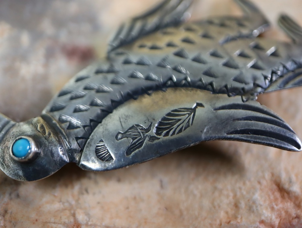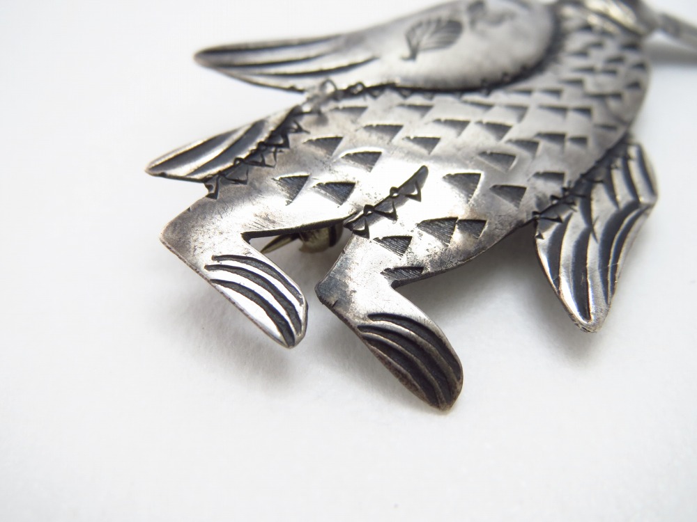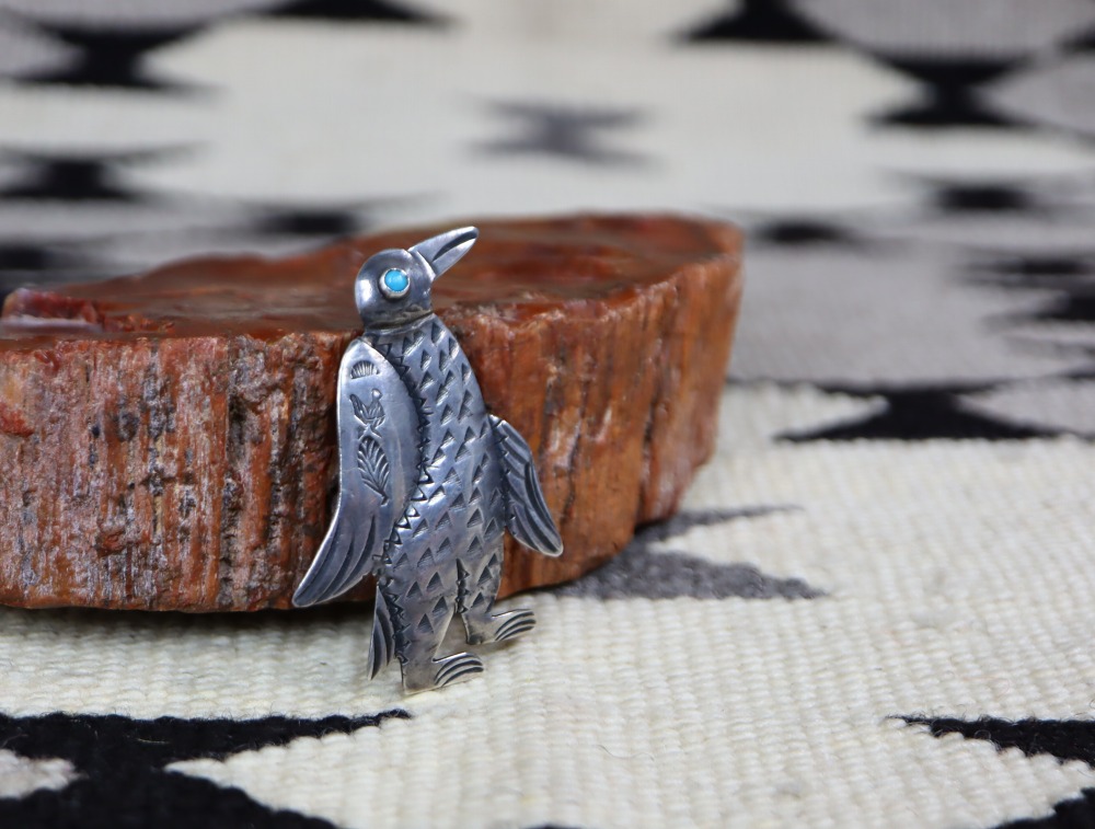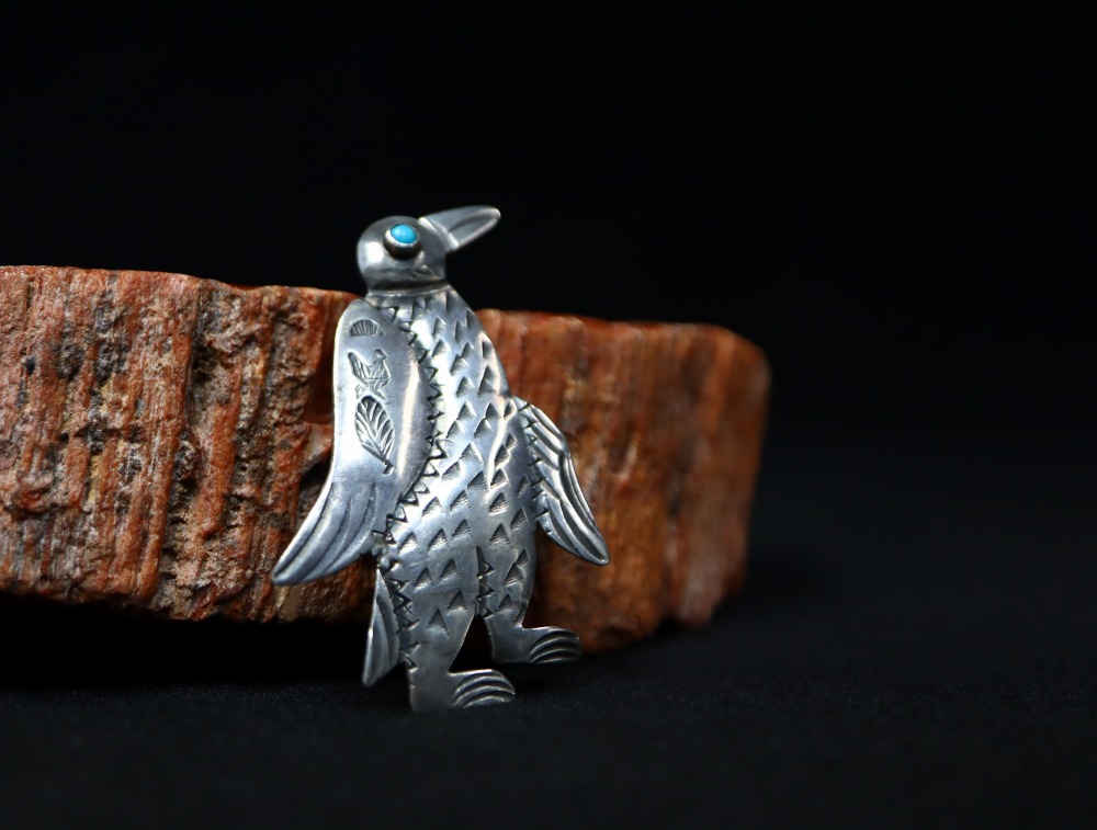 【NAVAJO】ナバホのアンティークジュエリー、ペンギンをモチーフとした可愛いデザインの作品で、質の高いシルバーワークやスタンプツール(刻印・鏨)も特徴的なアンティーク/ビンテージピンブローチです。