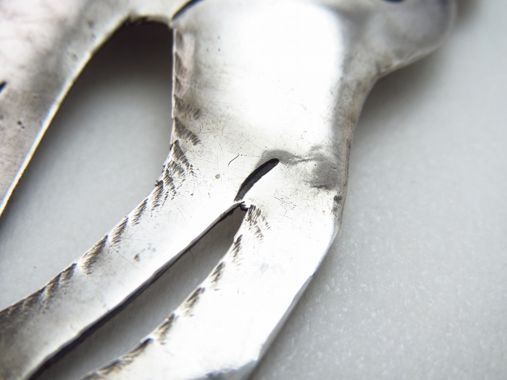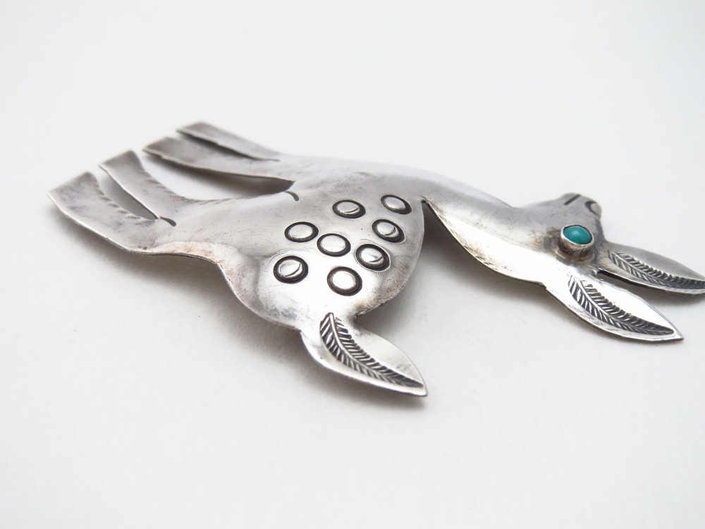 こちらの作品もアニマルモチーフでツーリストジュエリーのキャッチーな印象を持っていますが、丁寧なシルバーワークや高度なハンマーワークにより全体に立体的に仕上げられた完成度は、量産されたピースにはない良質感やハンドメイド独特の温もりを感じさせます。