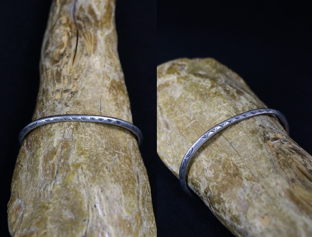 【NAVAJO】ナバホのアンティークジュエリー、インゴットシルバー(銀塊)から成形された独特な角度を持つナローなトライアングルワイヤー(竜骨型)をベースにしたアンティーク/ビンテージバングルです。