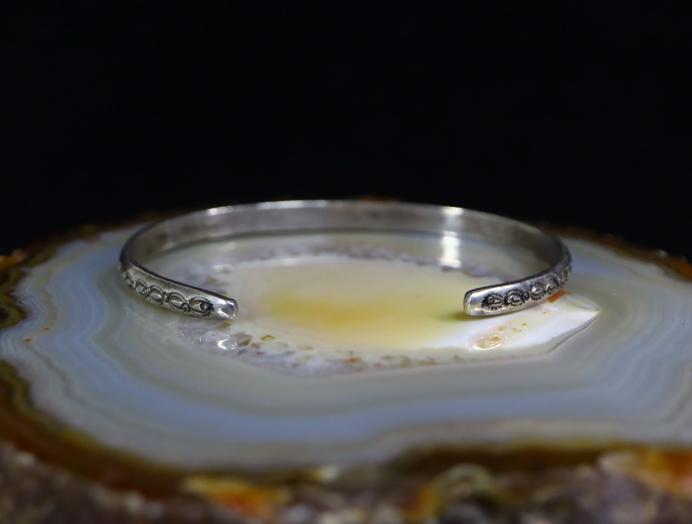 プリミティブな魅力と細いバンドによるこなれた印象がとても魅力的な作品で、細い幅のバングルとしては珍しい大きいサイズの作品となっています。