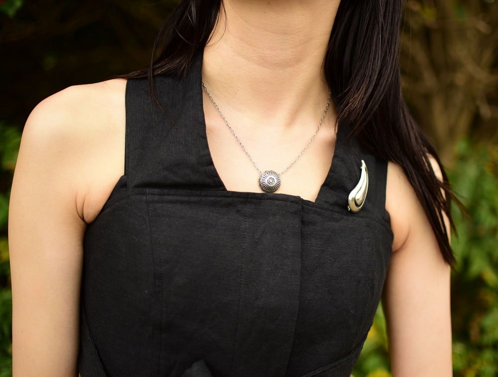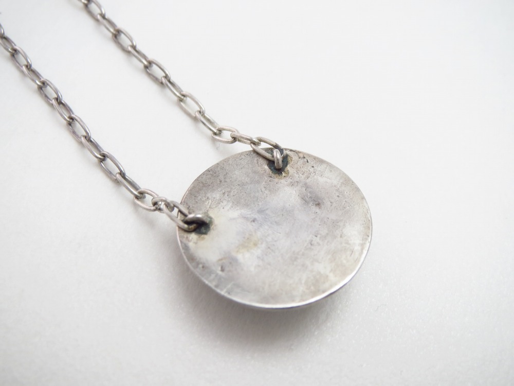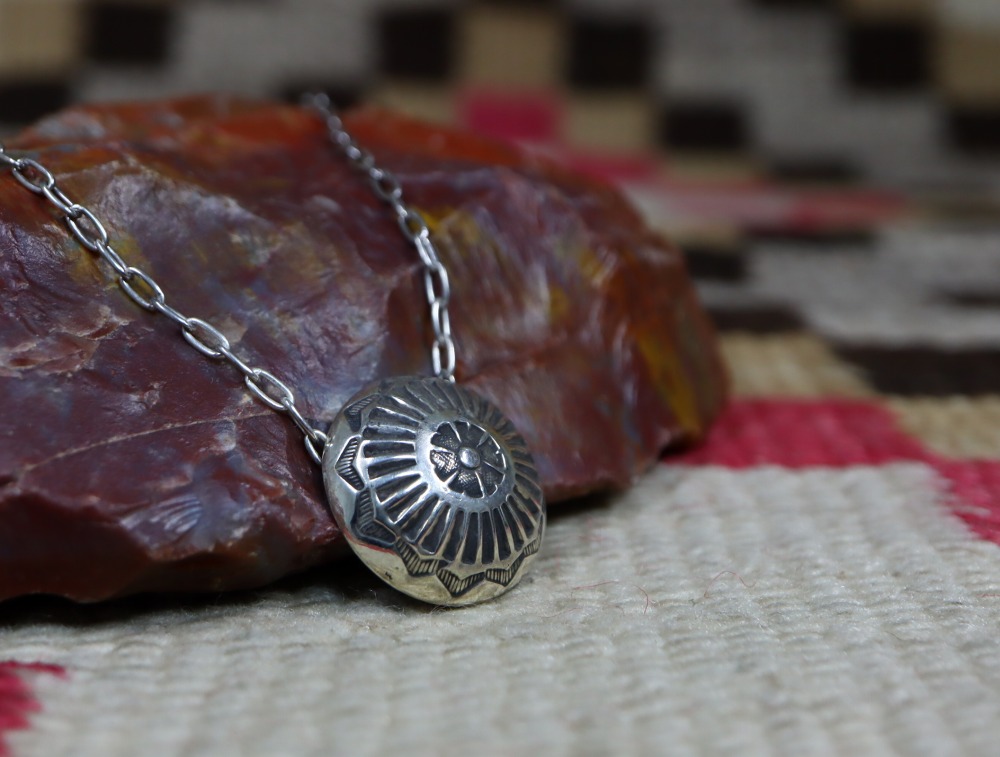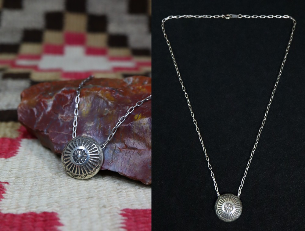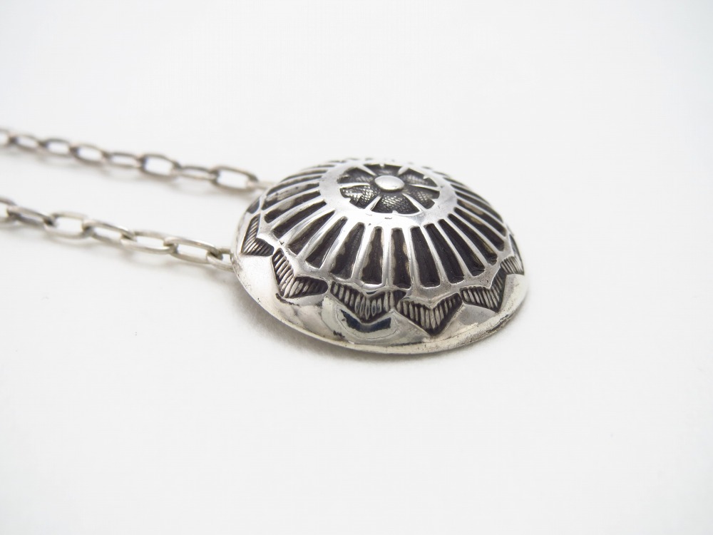 その独特の洗練された立体的なコンチョの造形は、インディアンジュエリーらしい素朴でナチュラルな印象を持ち、日常にさり気なくも奥行きを与えるアクセントになり得るネックレスです。