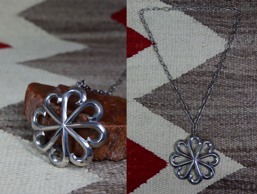 ナバホジュエリーのクラシックな造形スタイルを受け継いだ重厚な造りと、プリミティブな表情を持ちながらもどこかモダンな印象に仕上げられたネックレス。『ナバホギルド』で作られたことが明確で歴史的な資料価値も高く、大変コレクタブルでトレジャーハントプライスな作品の一つです。