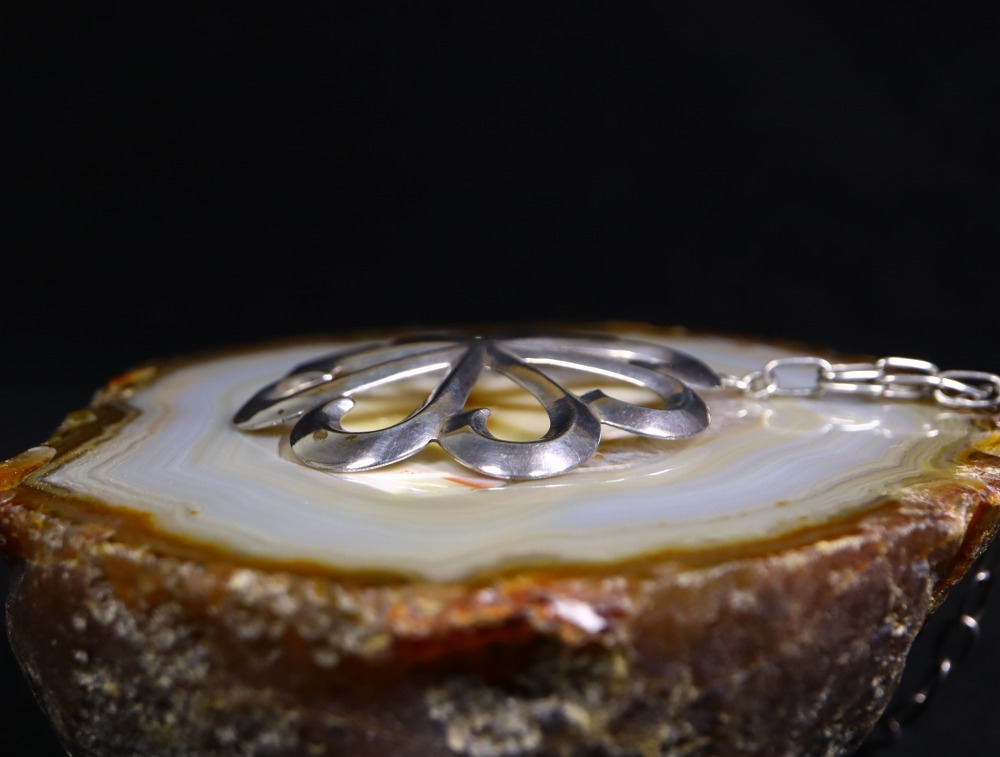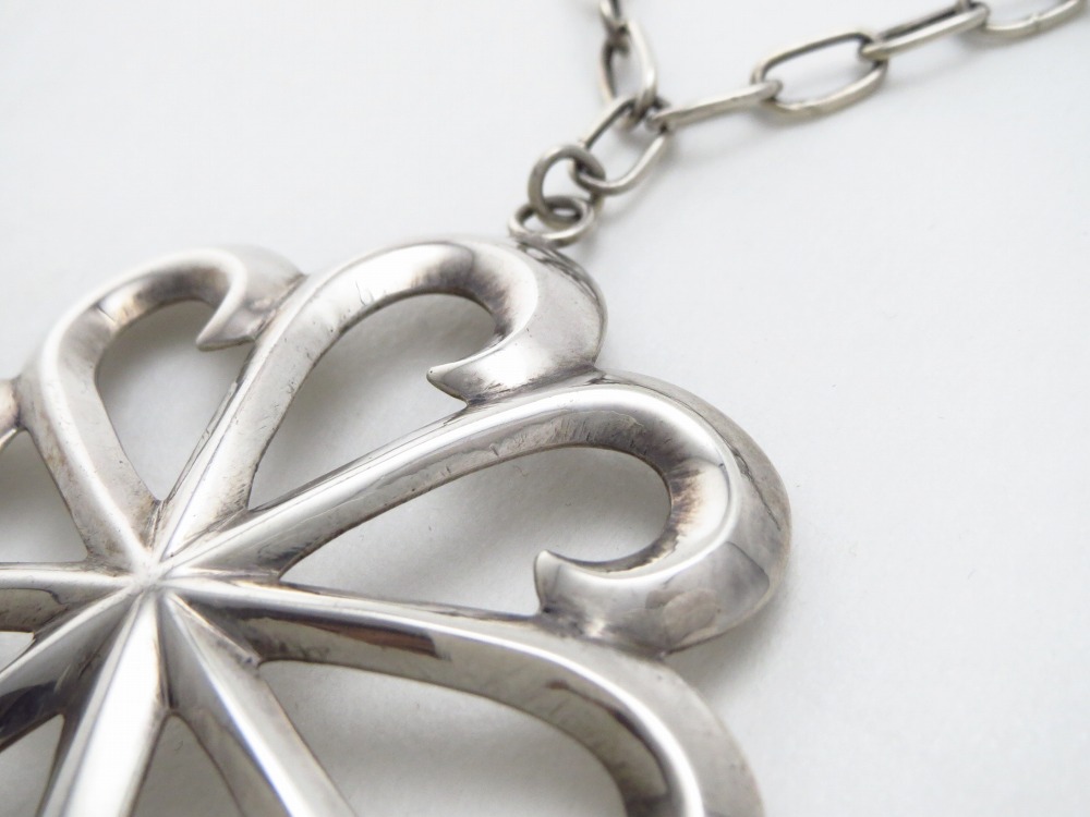 サンドキャスト成形で形作られた、風車の様な美しいフォルムが魅力的なトップとハンドメイドチェーンによって構成された作品となっています。