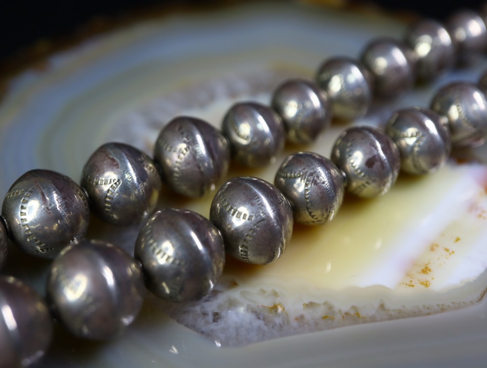 さらに本作では、球体としての成形前にスタンプを刻み込んでおり、複雑で奥行きを感じさせるナバホパール/シルバービーズに仕上げられています。