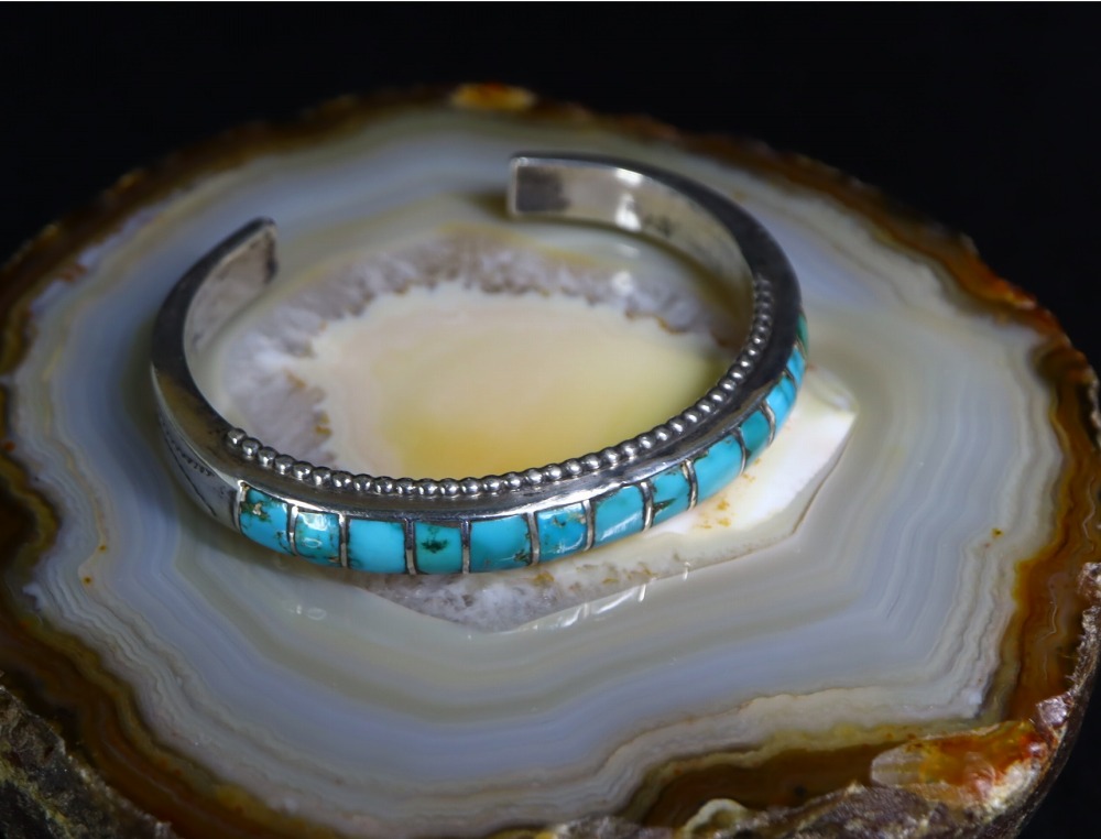 【ZUNI】ズ二のビンテージジュエリー、厚く重厚なバンドをベースにドームシェイプにカットされた美しいターコイズインレイが施されたアンティーク/ビンテージバングルです。