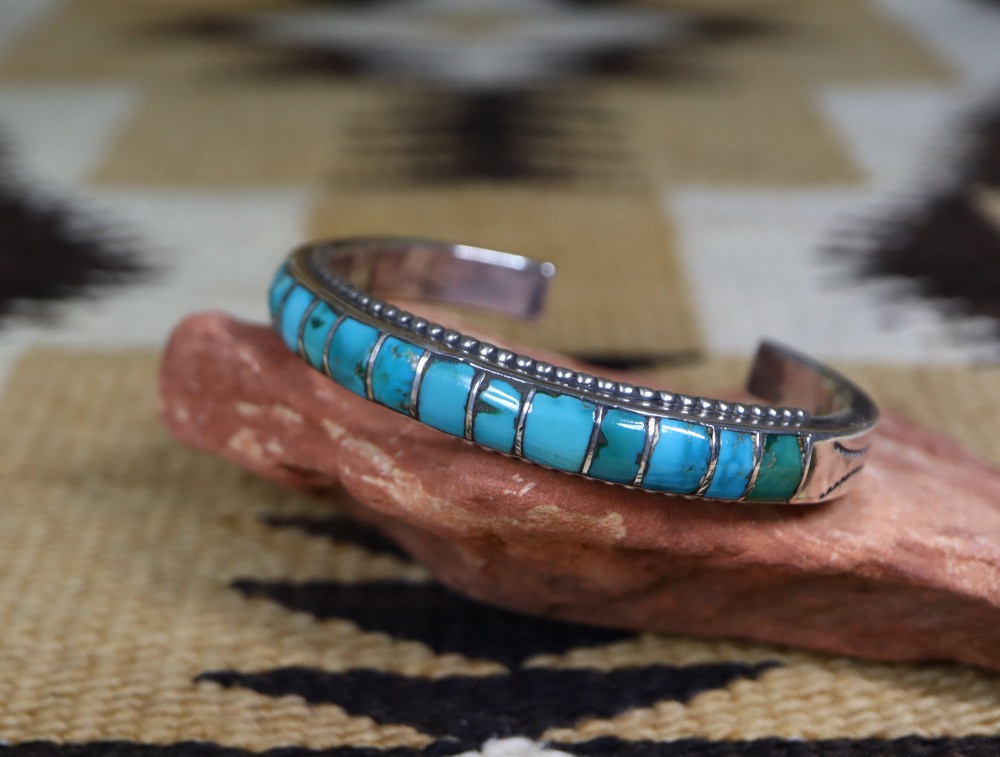 丁寧で重厚なシルバーワークをベースに、繊細なターコイズのカットにより、その美しさと際立った作品となっています。