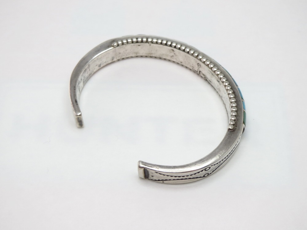 インレイワークは、シルバーワークによって格子状の区画分けが形成されており、そこに美しいターコイズがセットされています。
