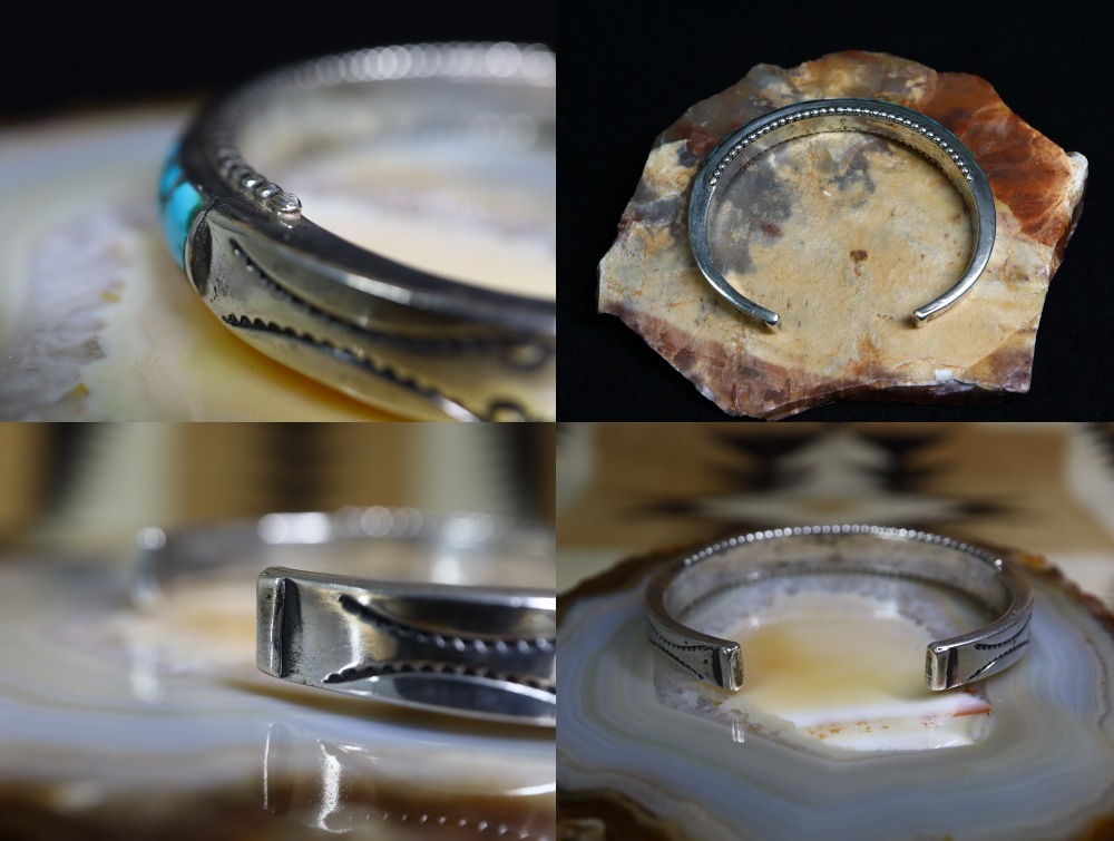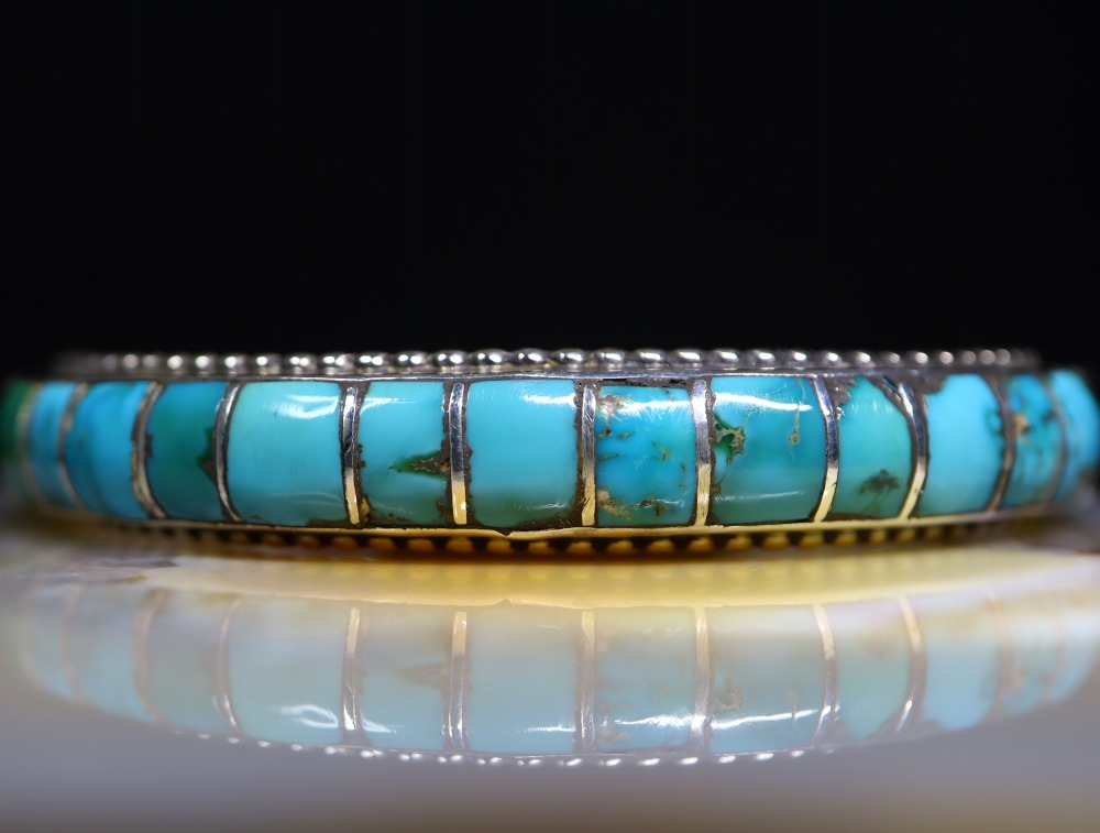 ターコイズのカットも大変特徴的で、バングルのカーブに合わせながらハイドームの曲面が作られ、非常に高度で綺麗な仕事からは、作者の卓越した技巧が感じられます。